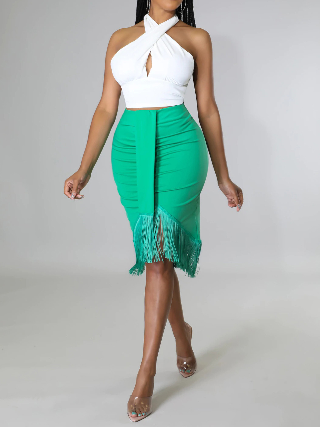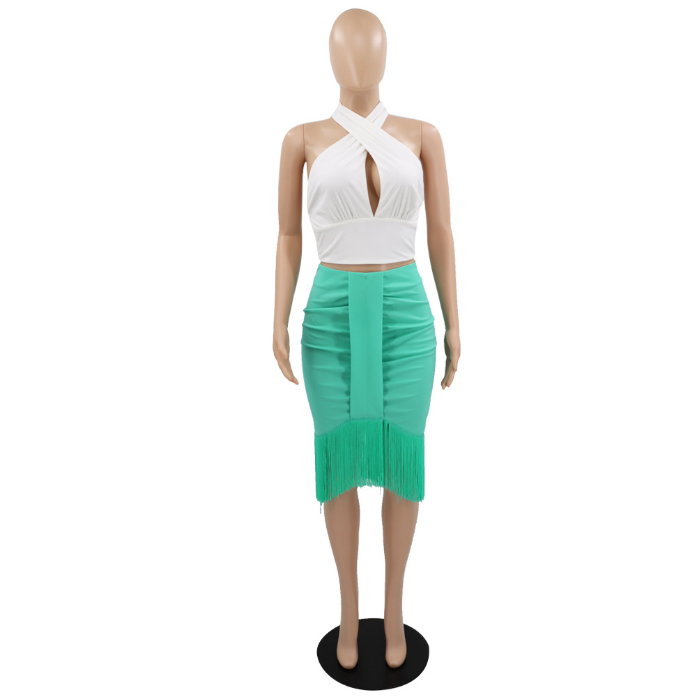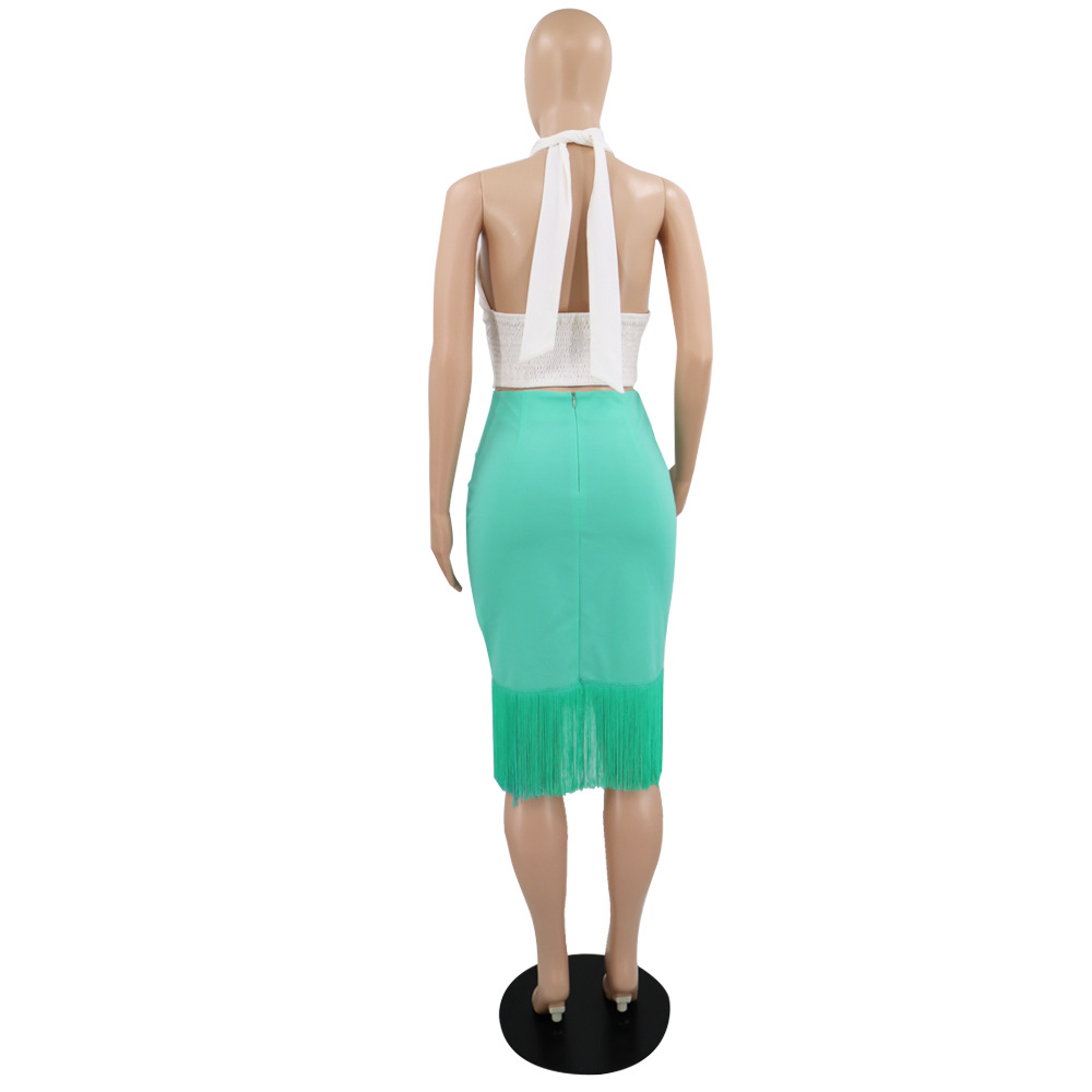 Women Halter Short Top Sheath Tassel Skirt Two Piece Set