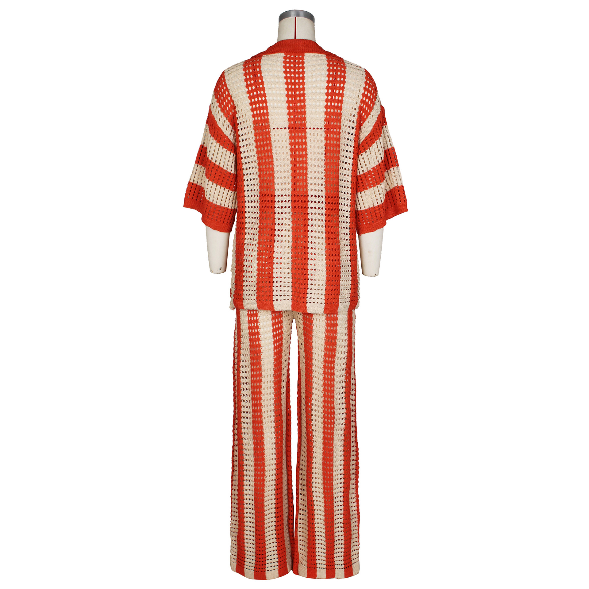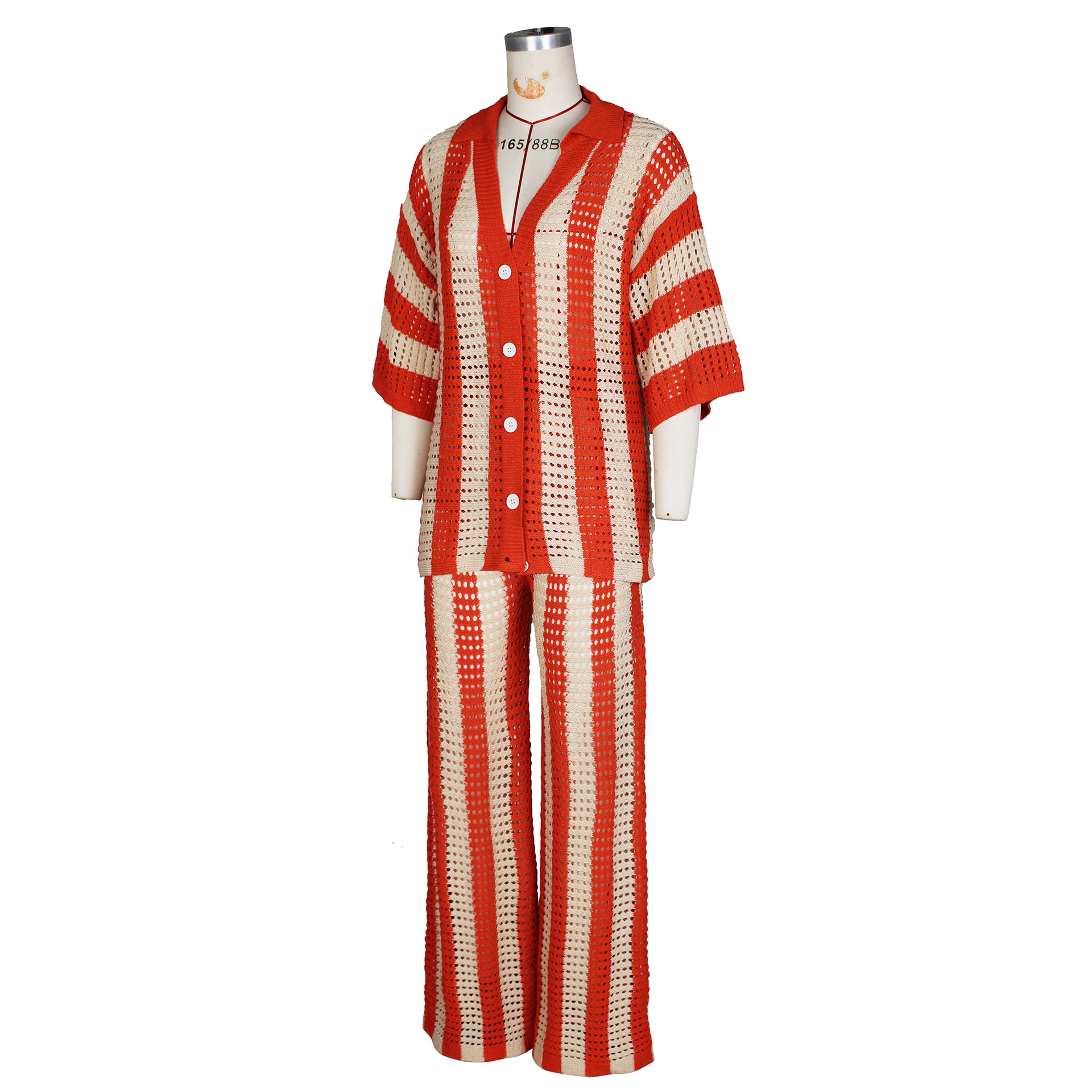 Women Clothing Sexy Ladies V neck Hollow Out Cutout Striped Collared Knitted Wide Blouse Pants Sets