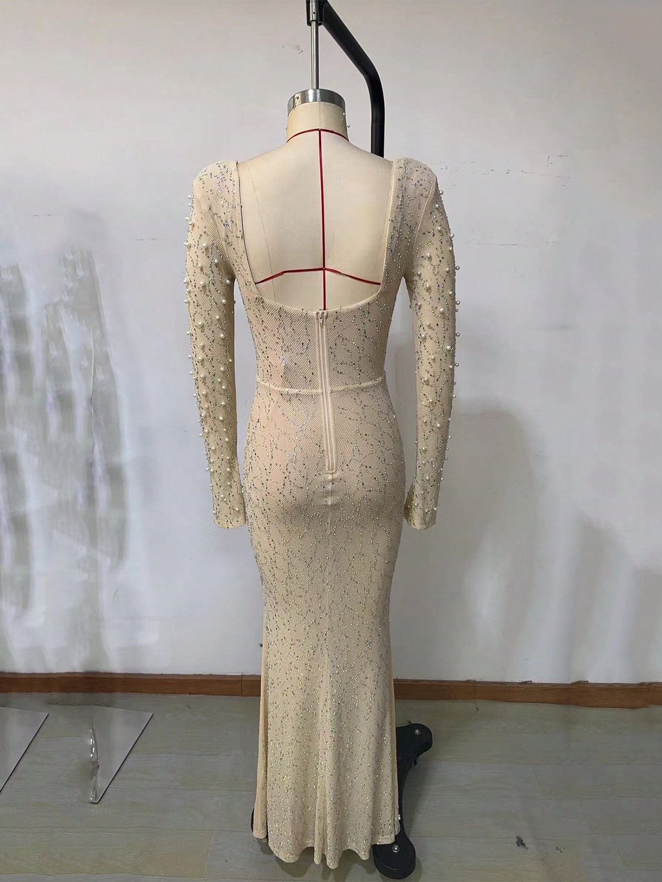 Arrival Gorgeous Mesh Drilling Beaded Square Collar Slimming Backless Long Fishtail Party Dinner Sling Formal Dress