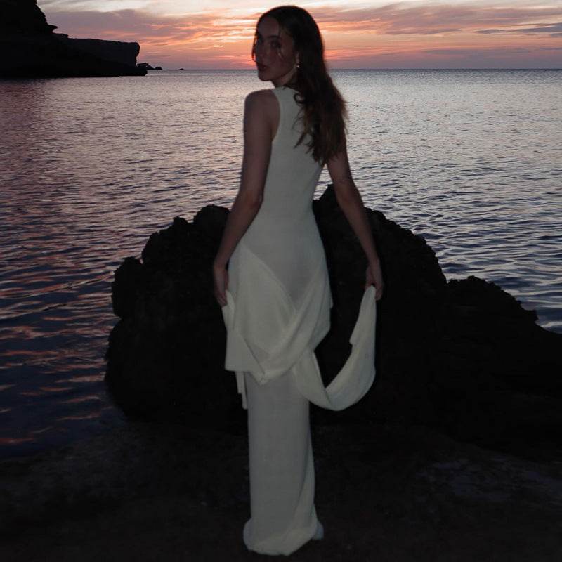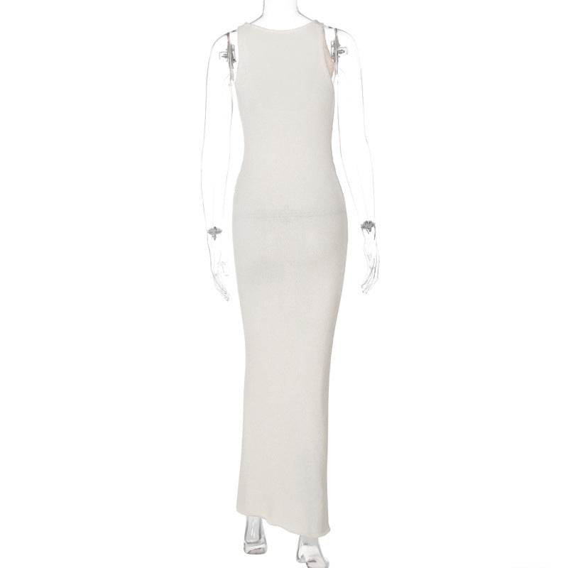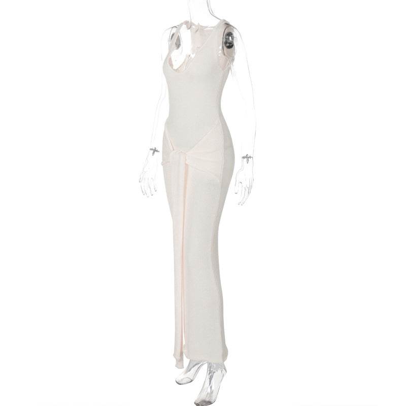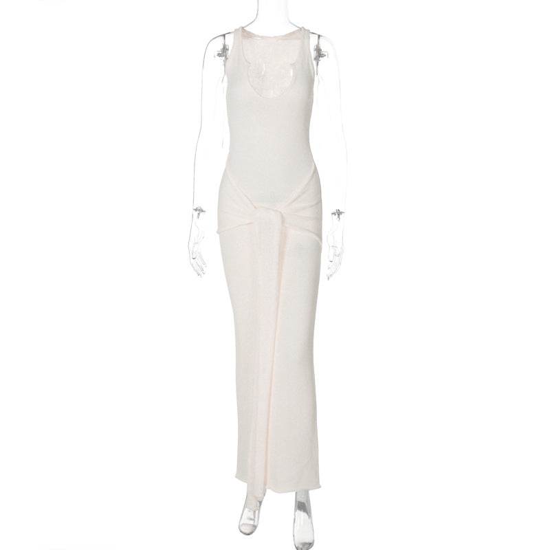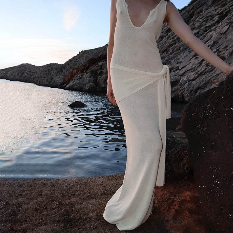 Deep V Plunge Solid Color See Through Sleeveless Stitching Ribbon Maxi Dress