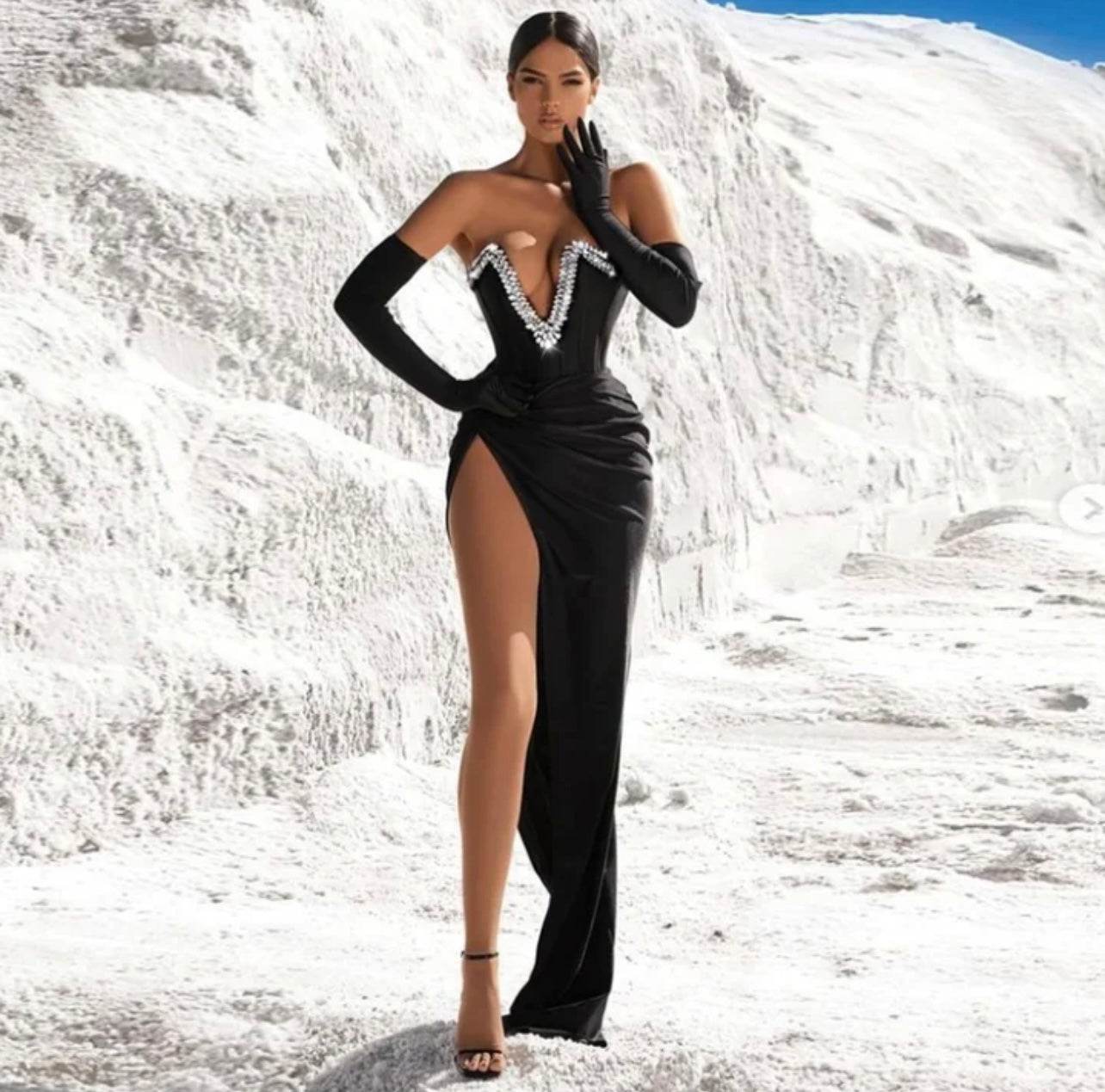 Diamond Strapless Deep V-neck High Split Ball Dress