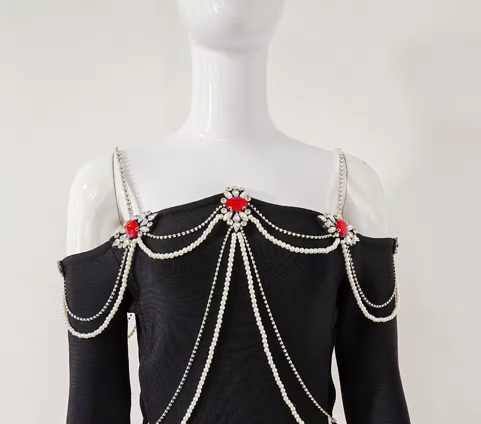 Crafted from high-quality bandage material, it hugs your curves in all the right places, ensuring a flattering fit. The eye-catching diamond bead chain detail adds a touch of glamour, making it perfect for special occasions or a night out.
