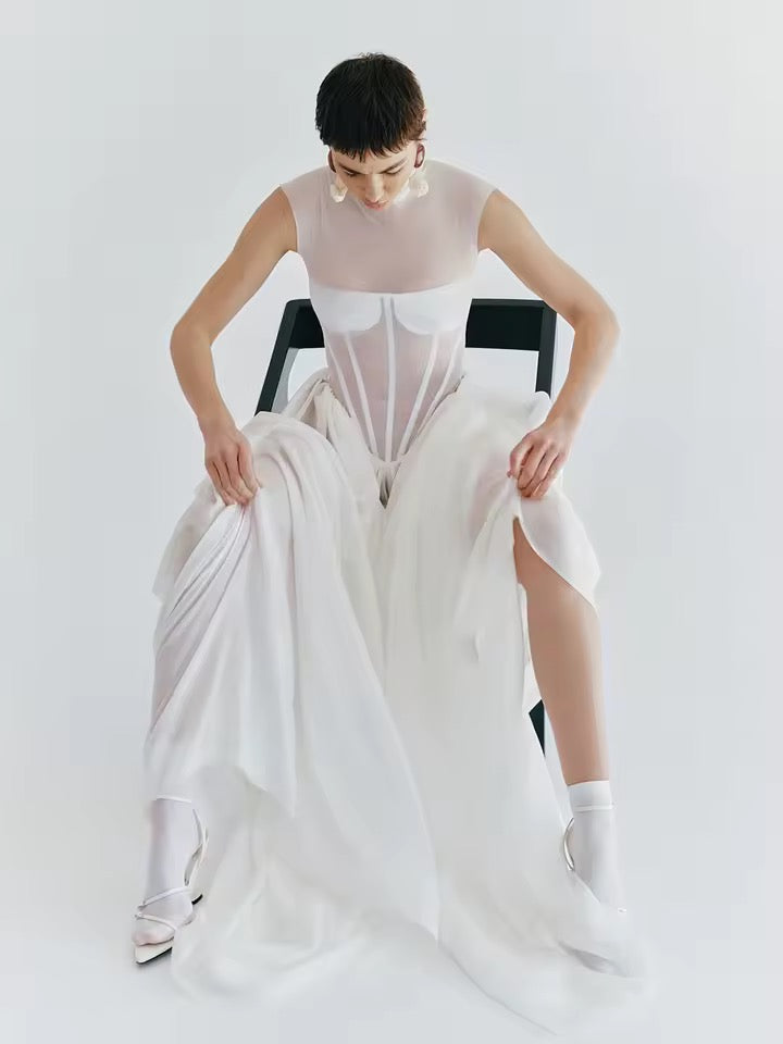See Through Mesh Slim Fit Oversized Hem Long Maxi Dress