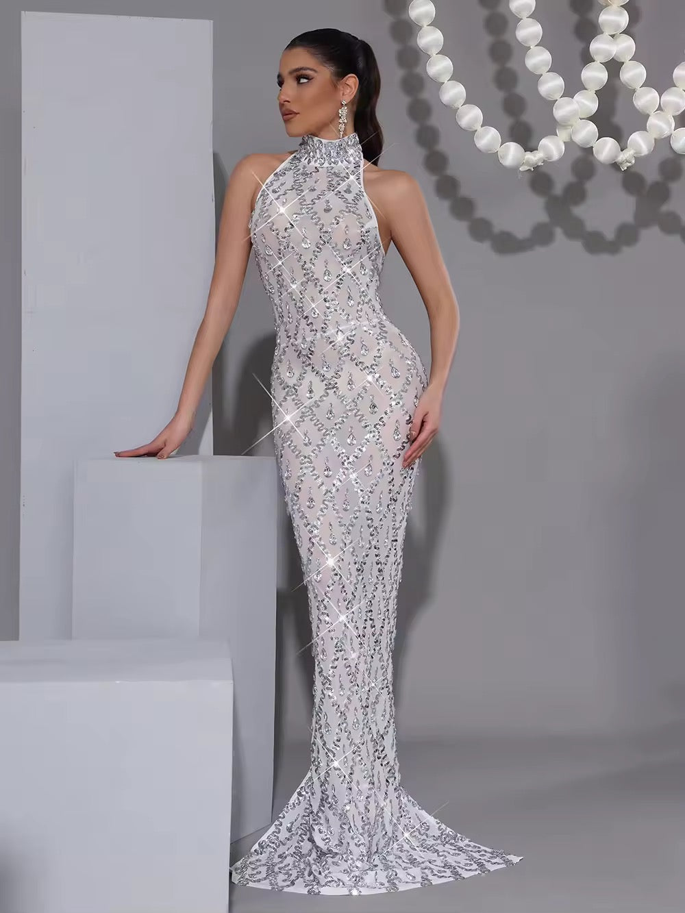 The Shining Diamond Sequins Mesh Long Dress is an exquisite choice for evening events, proms, and birthday celebrations. This stunning dress features a delicate mesh fabric adorned with shimmering diamond sequins, creating a captivating visual effect that is sure to turn heads.