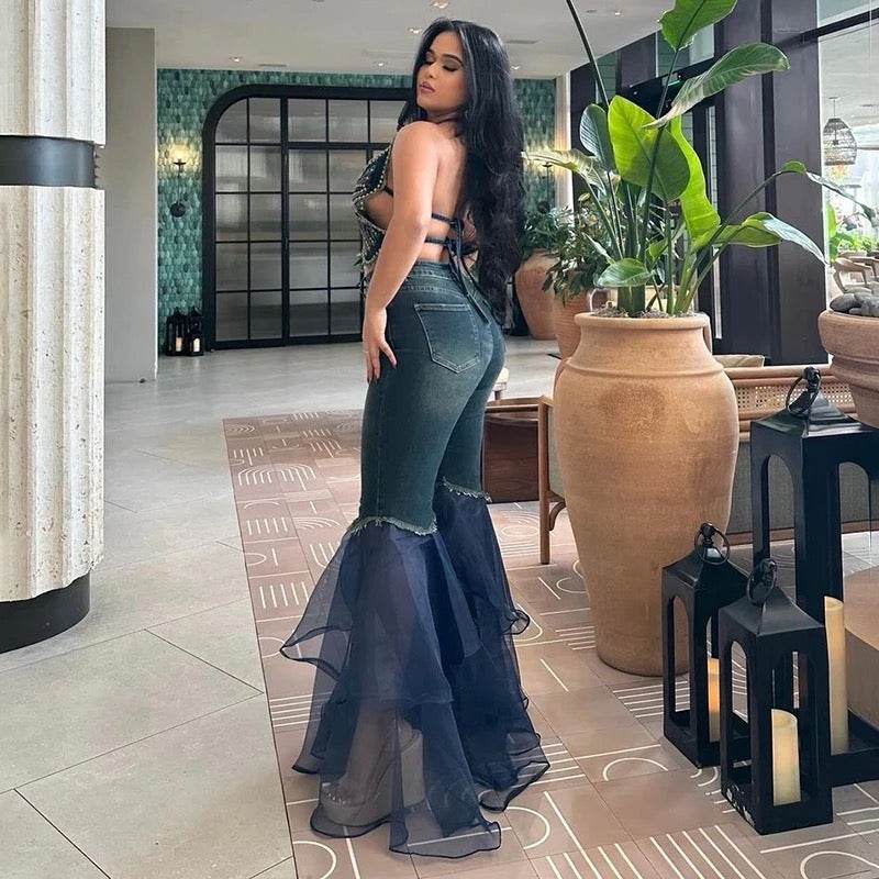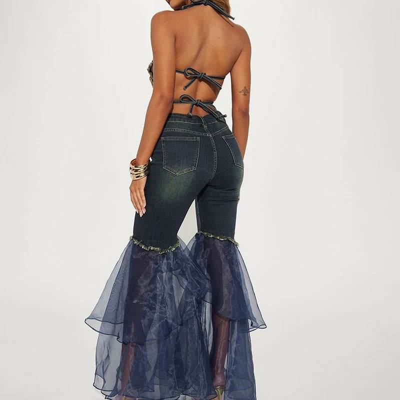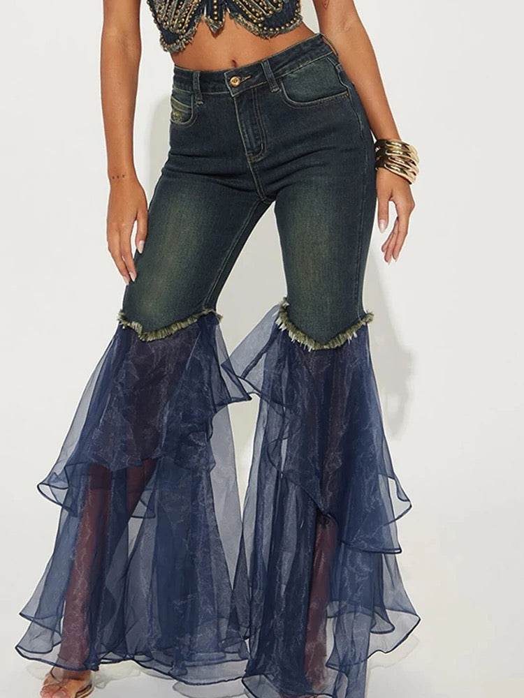 Sweet Denim Stitching Blooming Layered Chiffon Flare Trousers