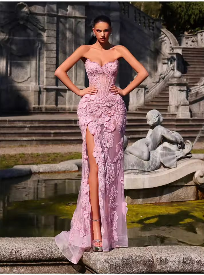 Introducing the Three-dimensional Heavy Industry Dish Flower Beading Sexy Tube Top Split Party Dress, a stunning addition to your wardrobe. This dress features intricate three-dimensional floral beading that adds a unique touch, making it perfect for any special occasion.