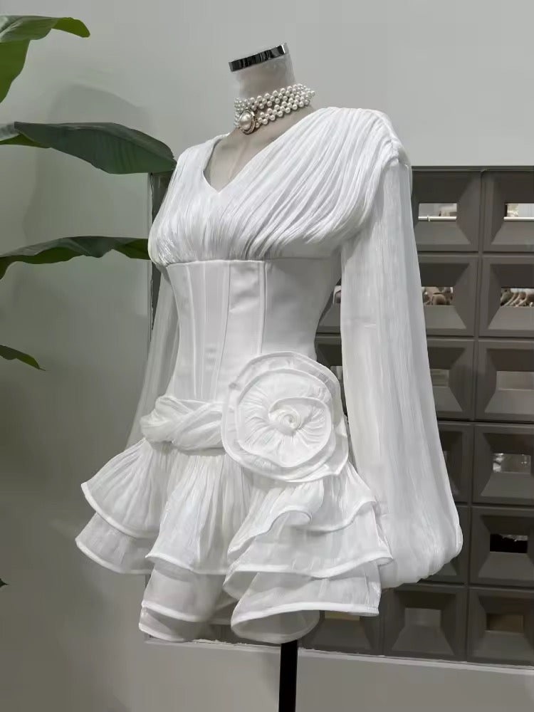V Neck Lantern Sleeve Ruffles Mini Dress