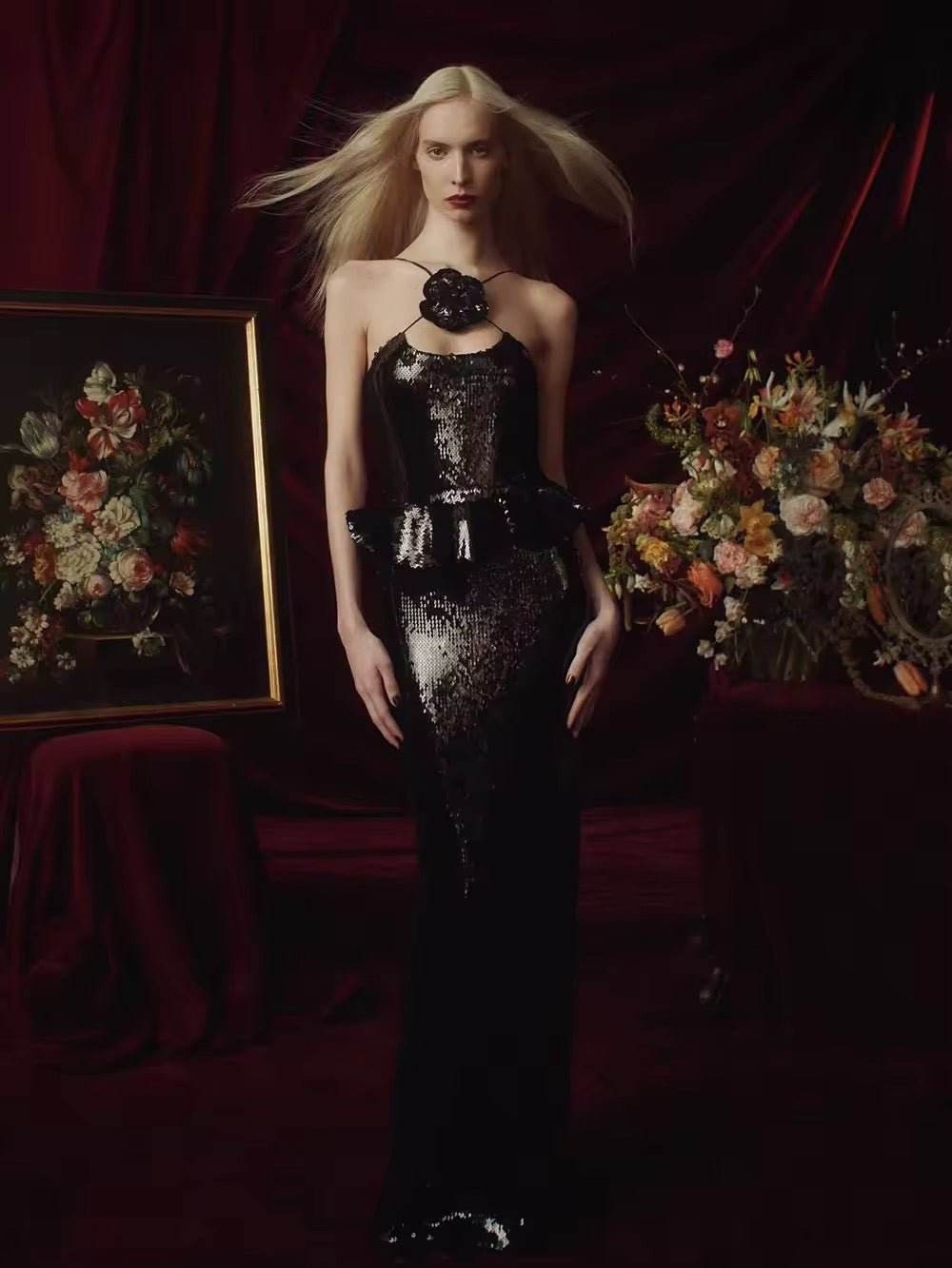Introducing the perfect dress for any special occasion - the Backless Halter Black Mesh Sequins Flower Maxi Long Gowns Dress from Rebeca the Label. This stunning dress features a halter neckline and a backless design, adding a touch of elegance and sexiness to your look. The black mesh fabric is adorned with delicate sequins and flower details, creating a beautiful and eye-catching design. The maxi length adds a touch of sophistication, making it perfect for formal events or a night out on the town.