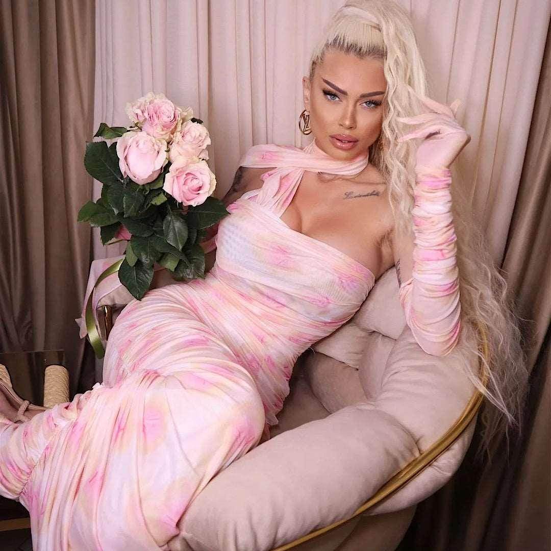 Make a stunning statement in this Dress. This maxi dress hugs your curves in all of the right places, and comes with long mesh gloves that add an elegant touch. The mesh ribbon around the neck will make you feel chic and beautiful. Complete the look with a pair of heels and statement earrings.