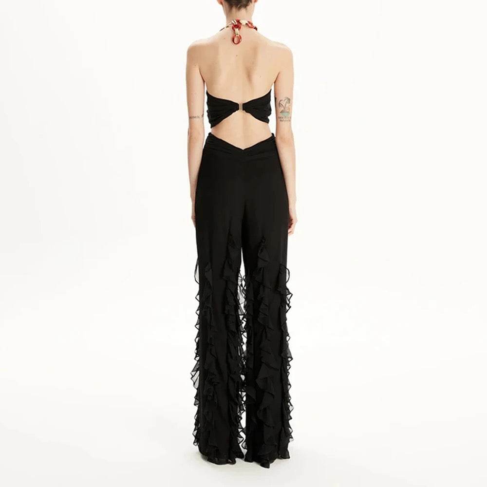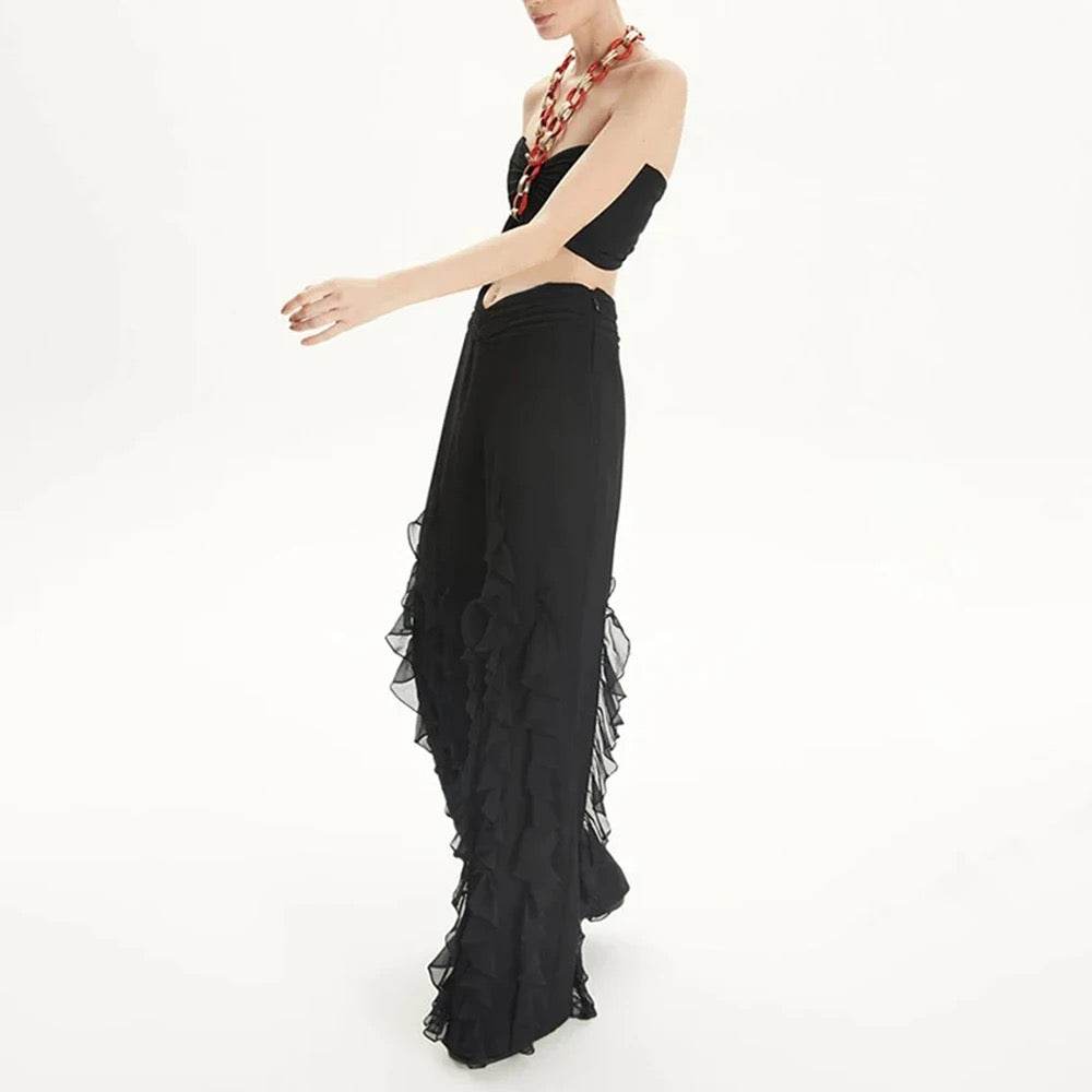 Black Short Top Ruffle Edge Long Pants 2-piece Set