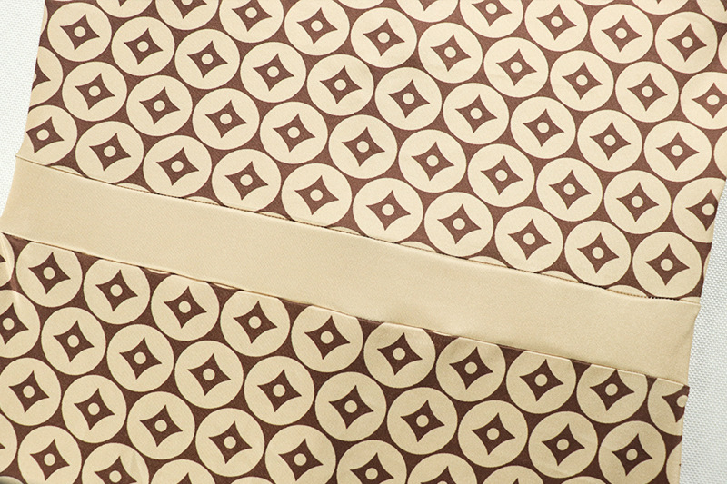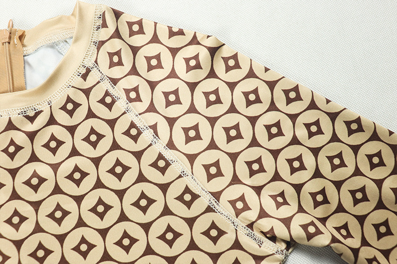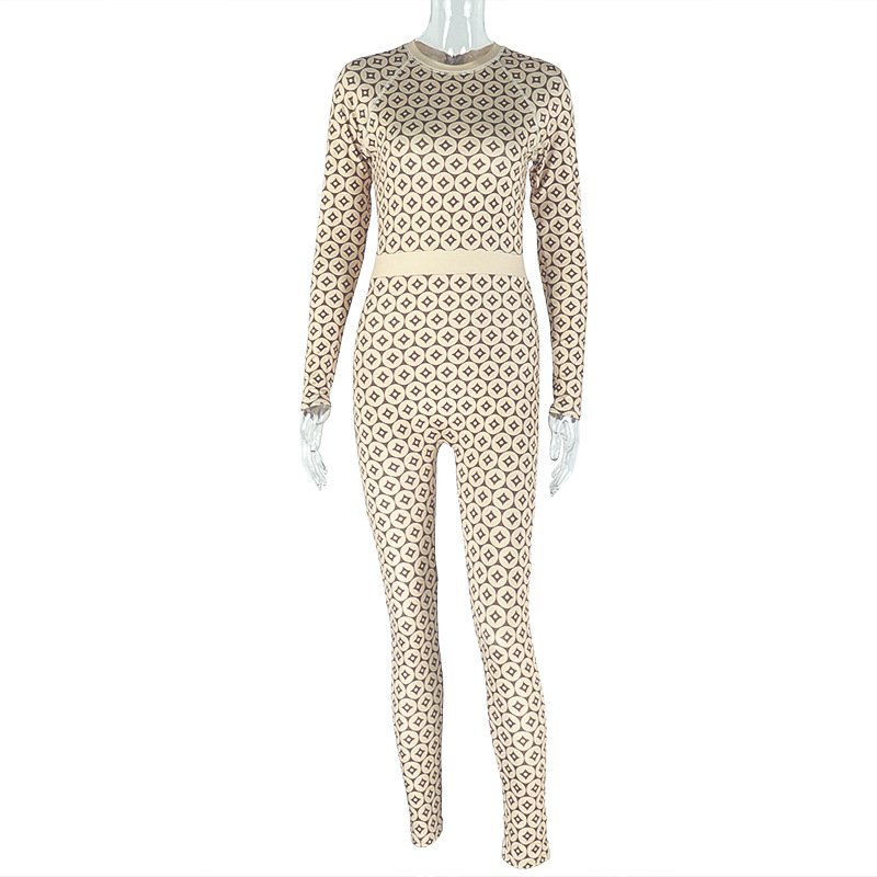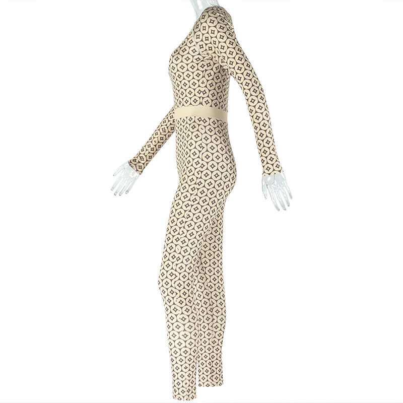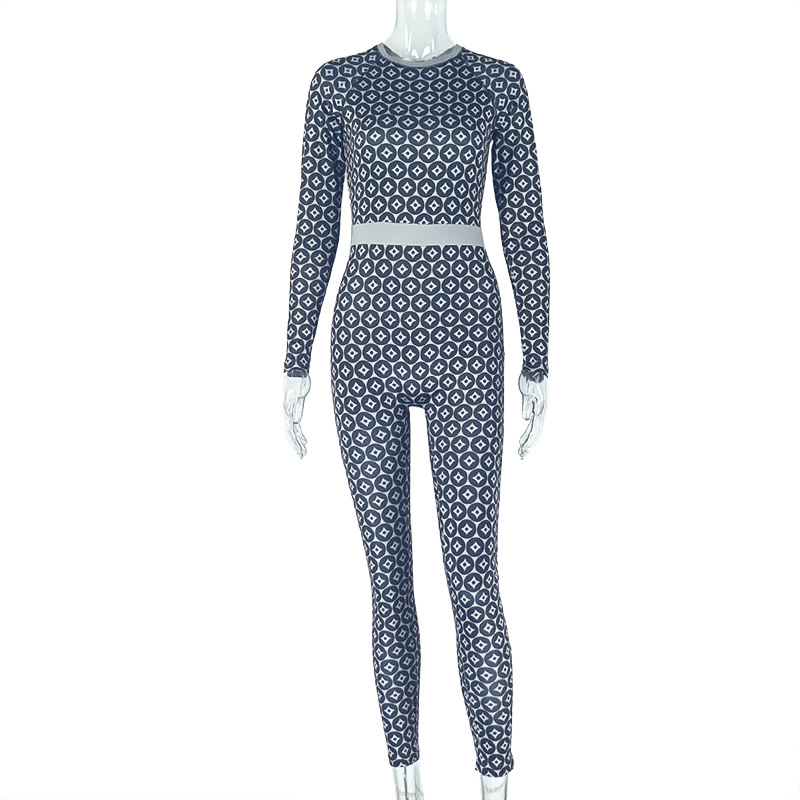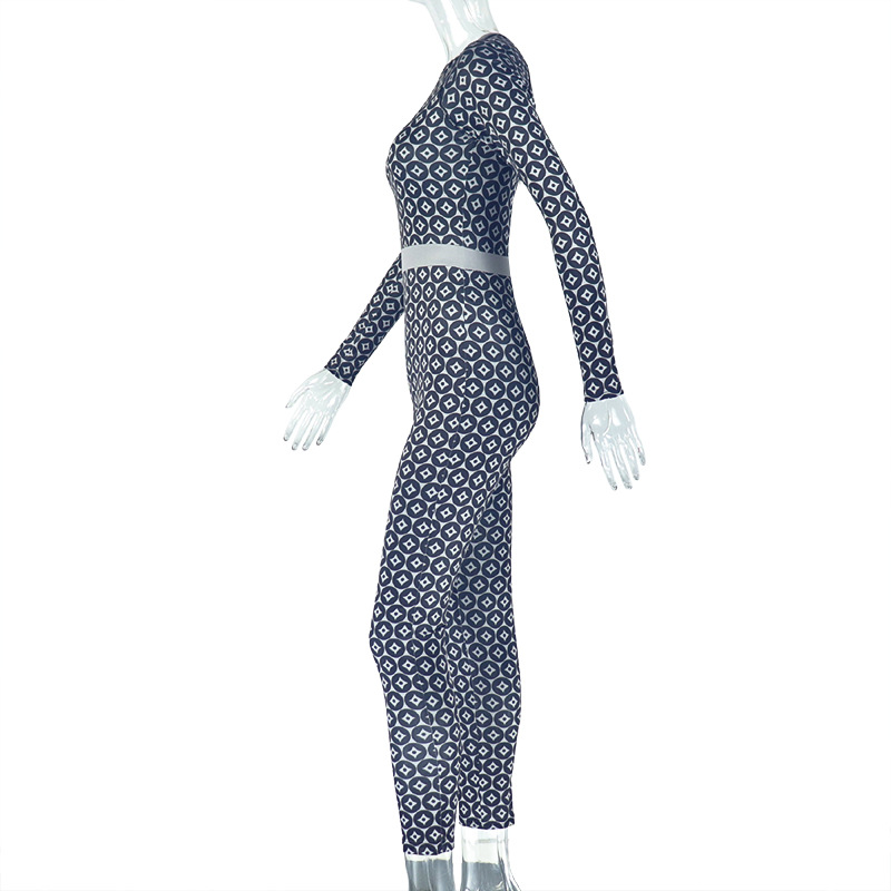 Waist Tightening Print round Neck Long Sleeve Jumpsuit