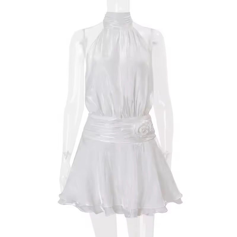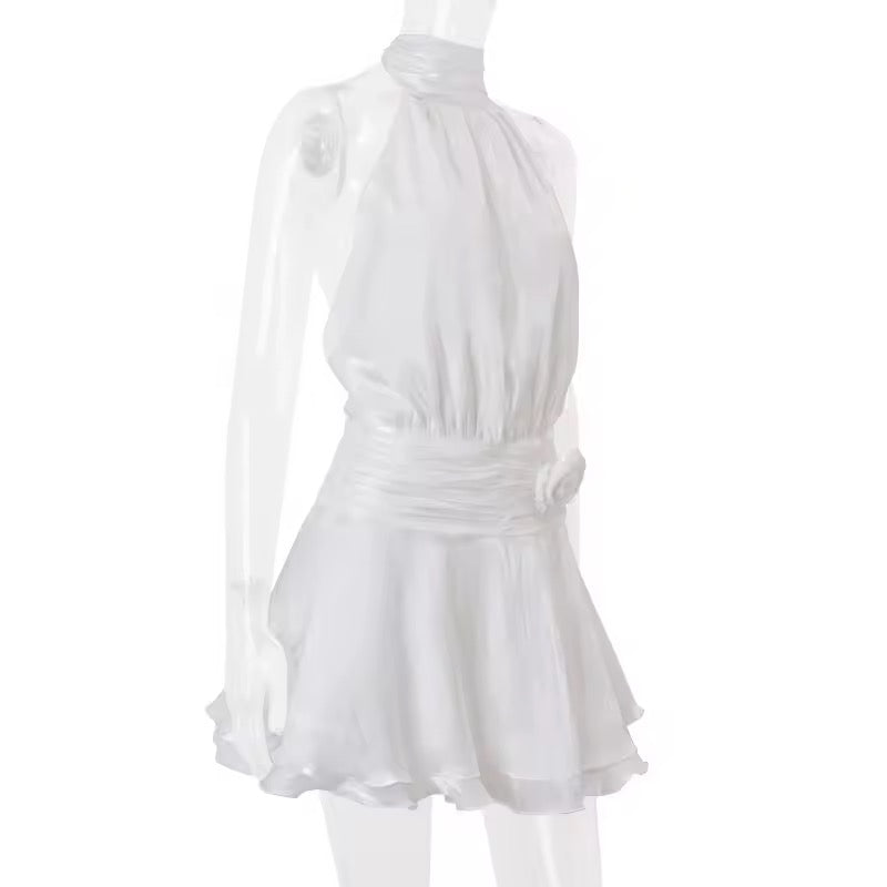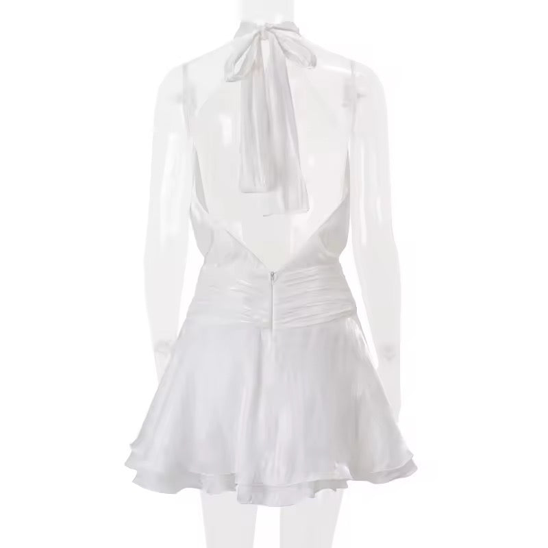 The backless design adds a touch of allure, while the mini length showcases your legs beautifully. Ideal for summer parties or romantic evenings, this dress combines elegance with a hint of sexiness. Pair it with your favorite heels and accessories for a complete look that will turn heads.