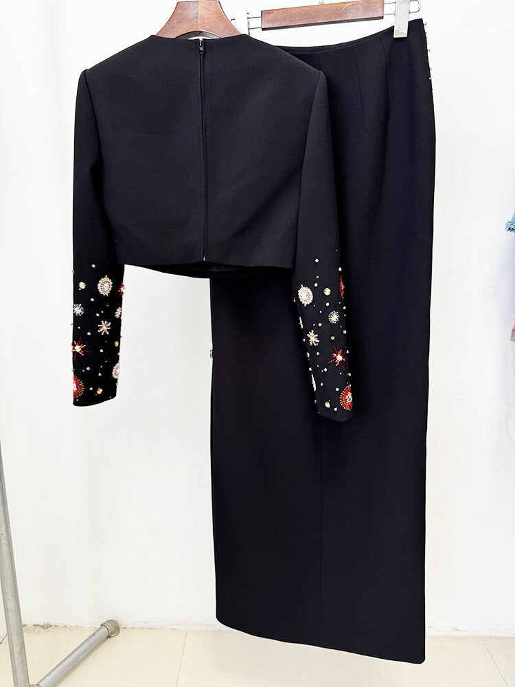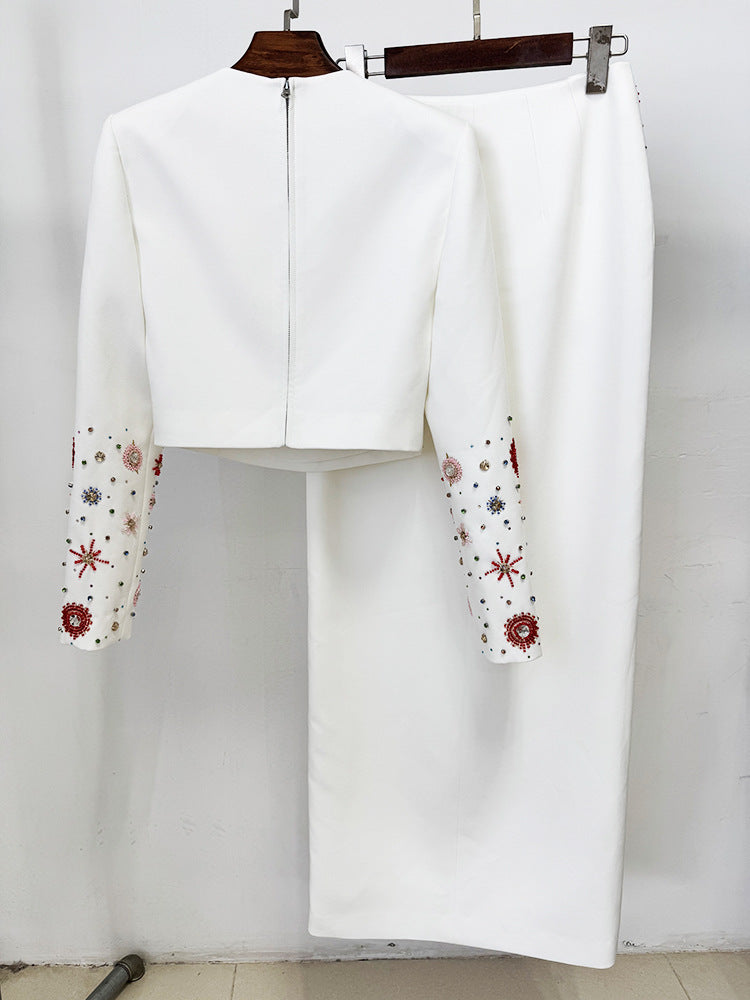 Crystal Long 2 Piece Skirts Suits Sexy Crop Tops Beading Midi Skirts Suit