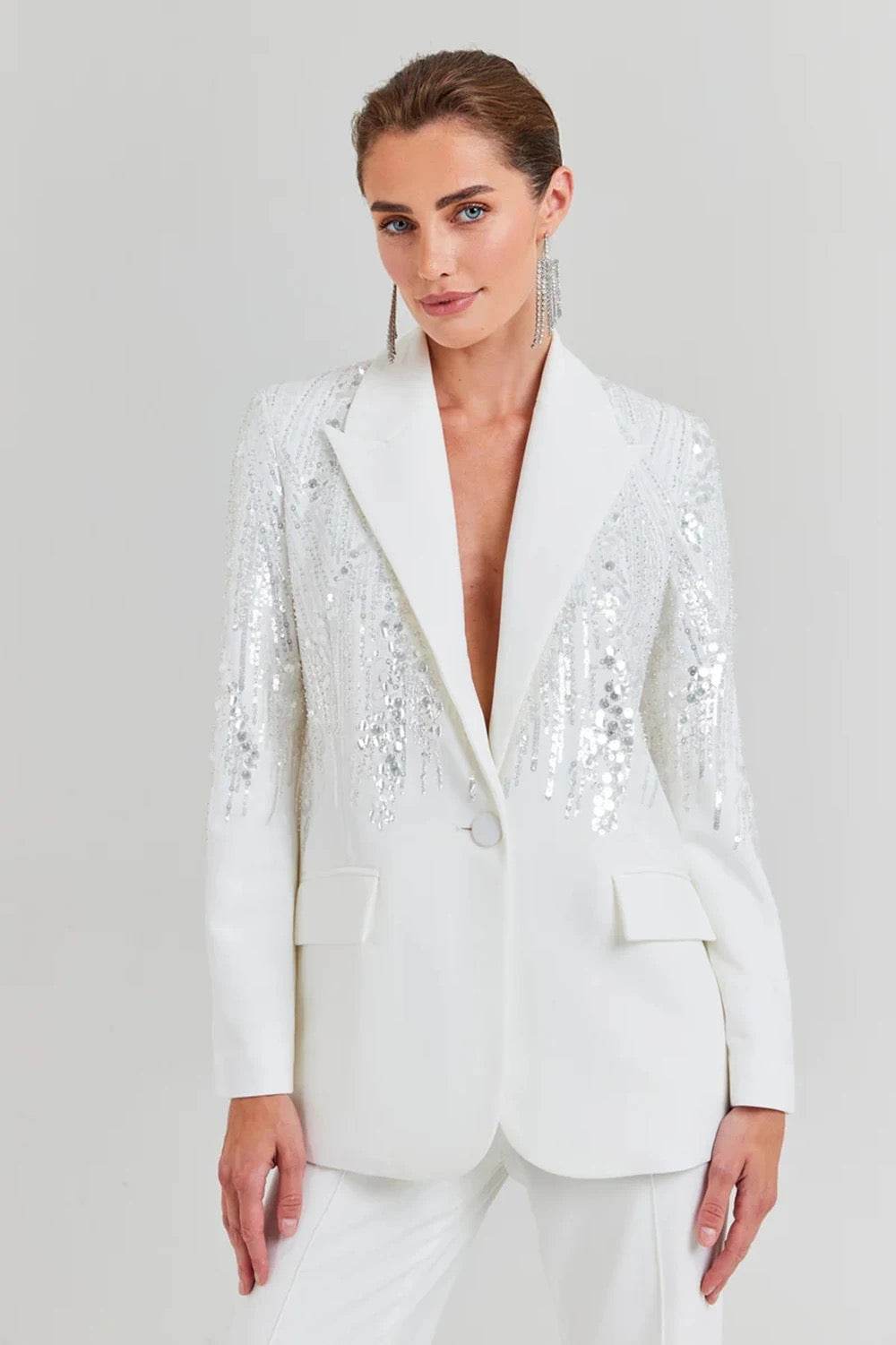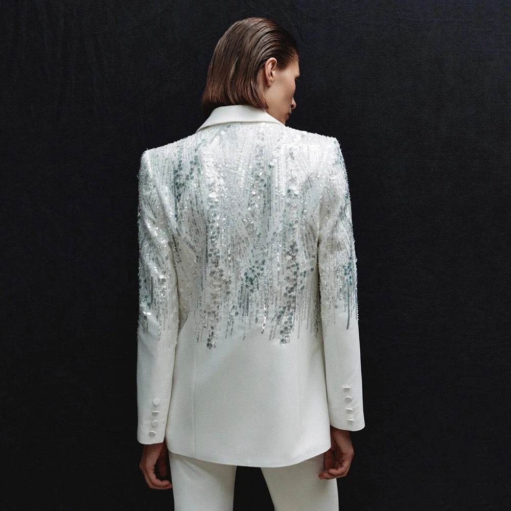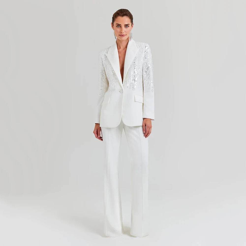 Diamond Two Piece Set with Polo Collar, Long Sleeves, Sparkling Blazer Wide Leg Pants
