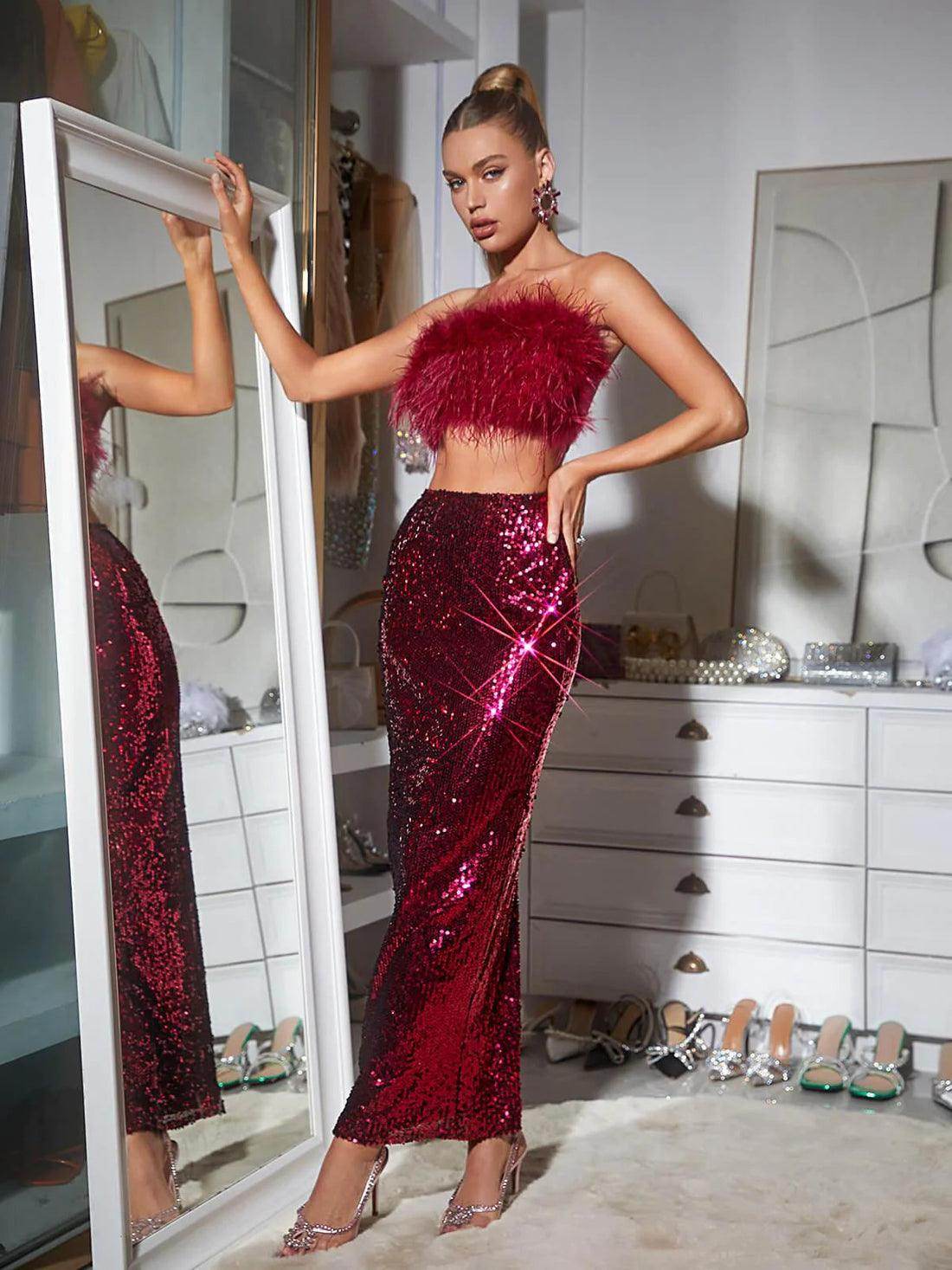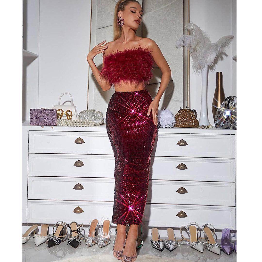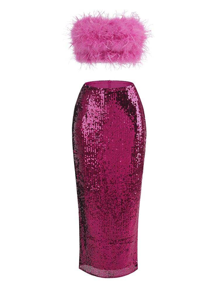 Two-Piece Set: hot pink top and sequins skirt Please note due to the material of this dress, some feathers might fall. This is not a fault.