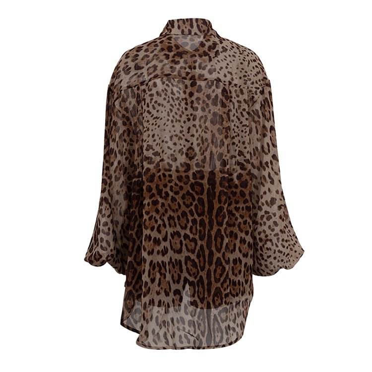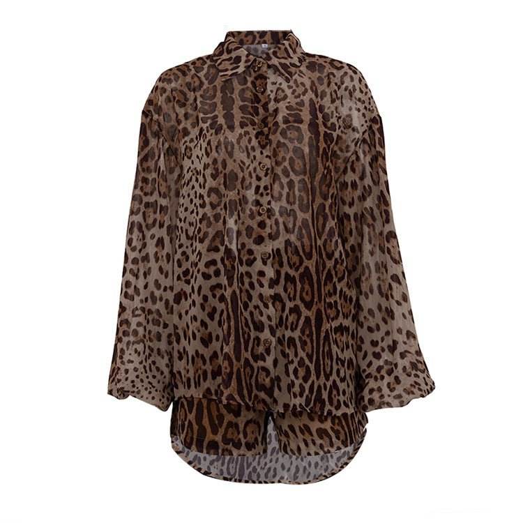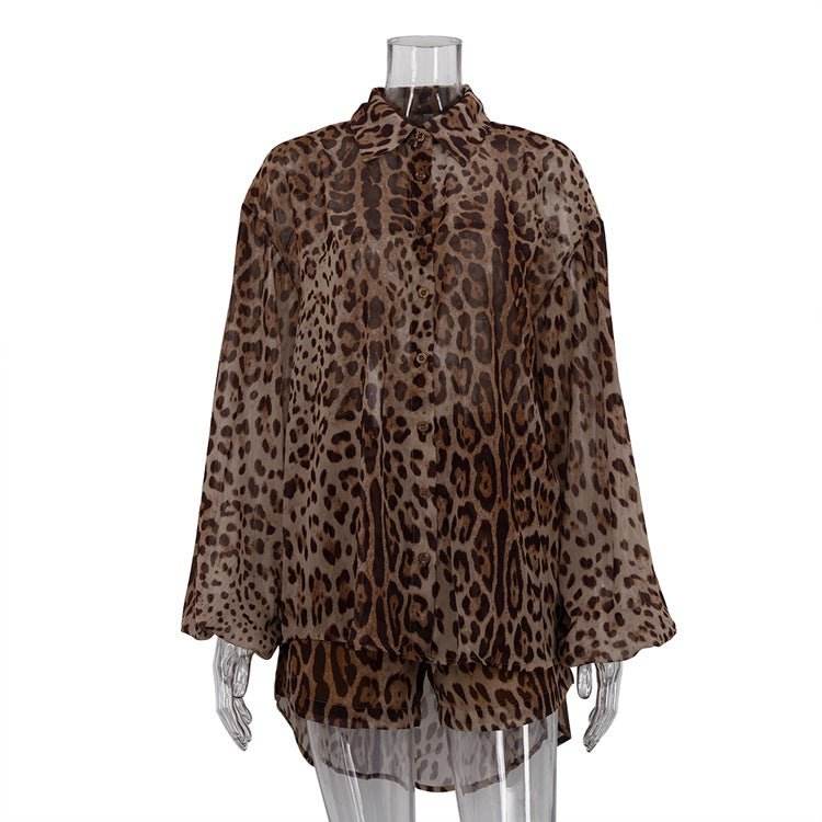 Leopard Print Loose See through Long Sleeves Shirt Shorts Two Piece Set