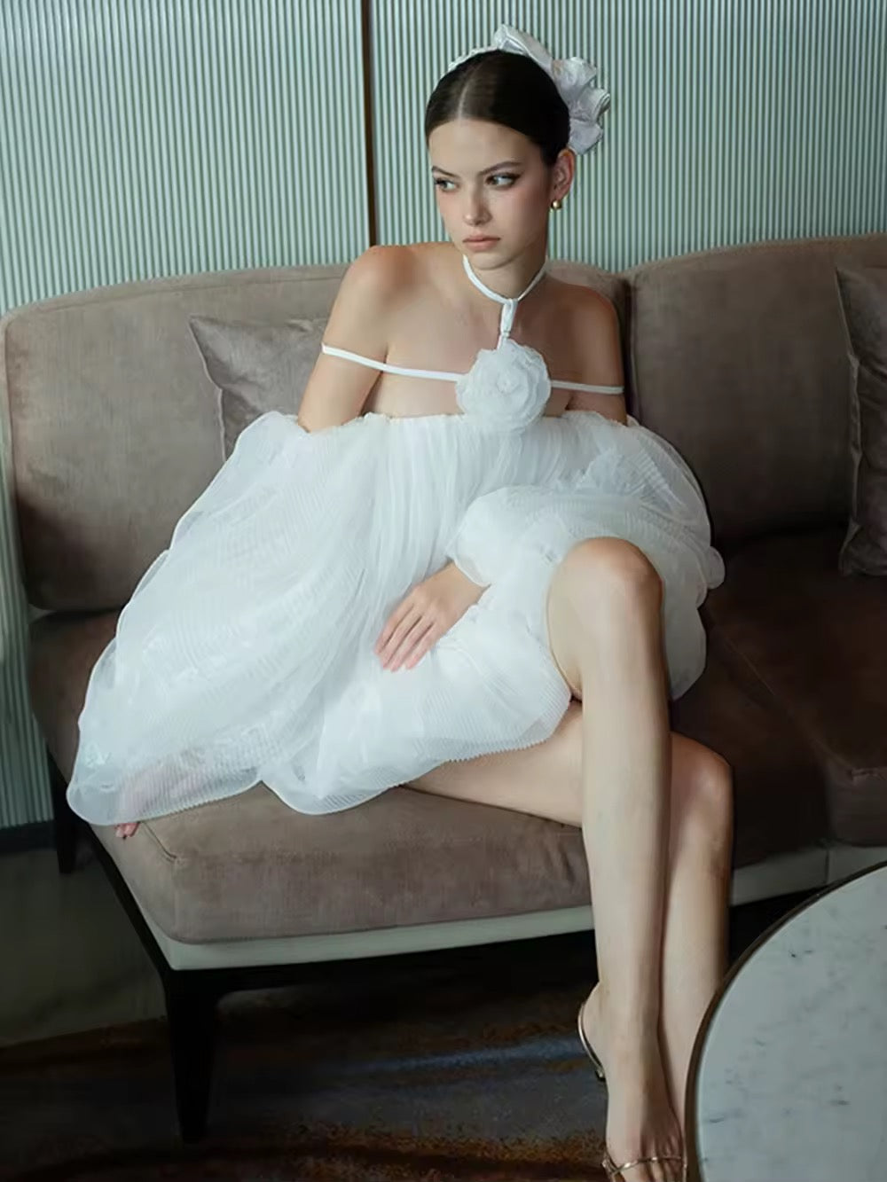 Loose Sexy Flower Mesh Off Shoulder Halter Mini Dress