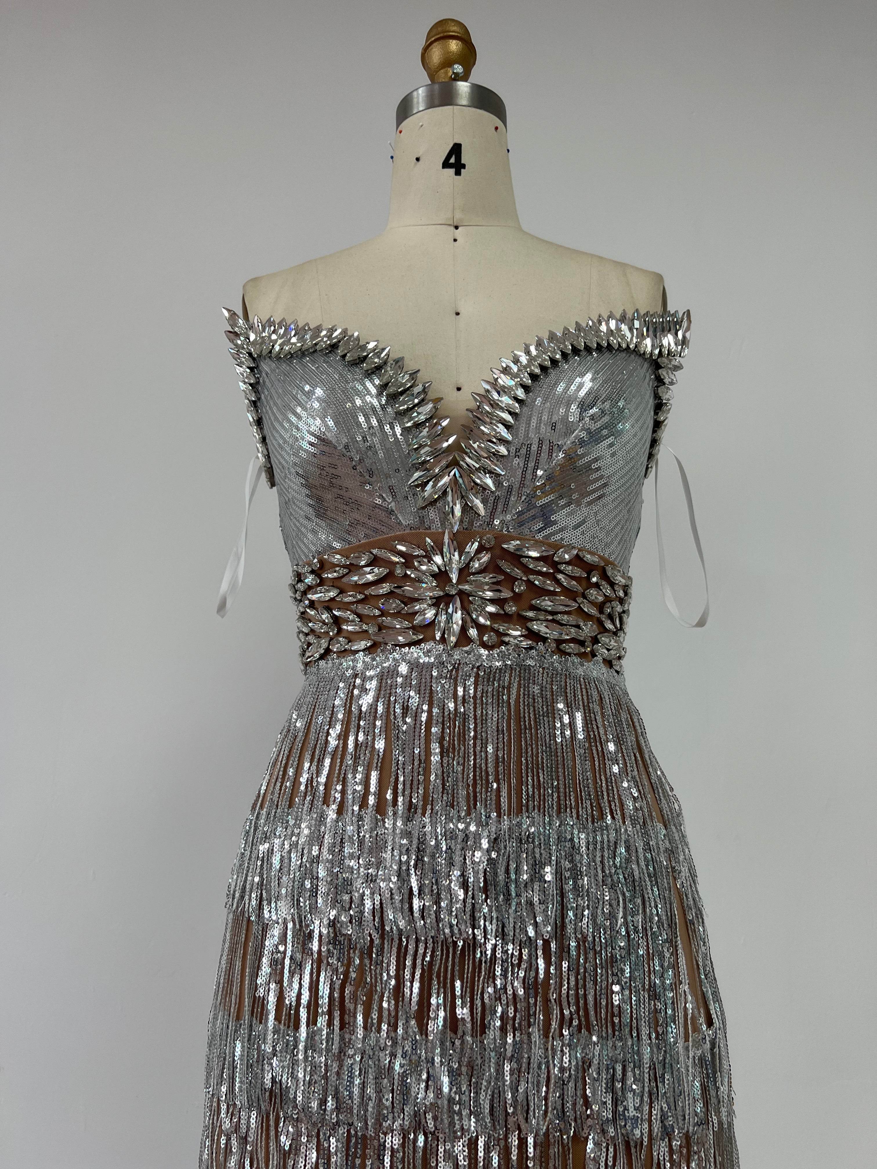 The strapless neckline has an illusion sweetheart style, thin straps that form into a lace-up back and fitted bodice. Covered in mirror work that will have all eyes on you and completed with a fun feathered skirt that will sway with every dance move you make!