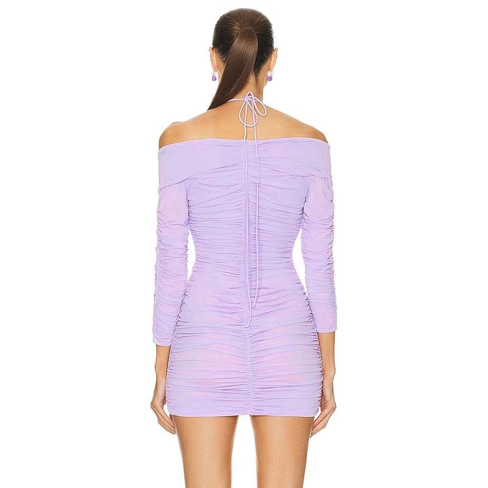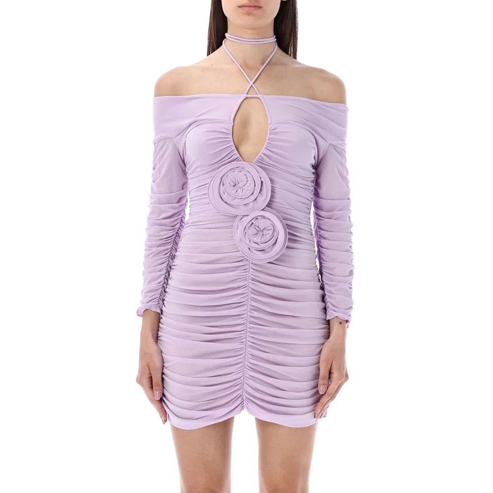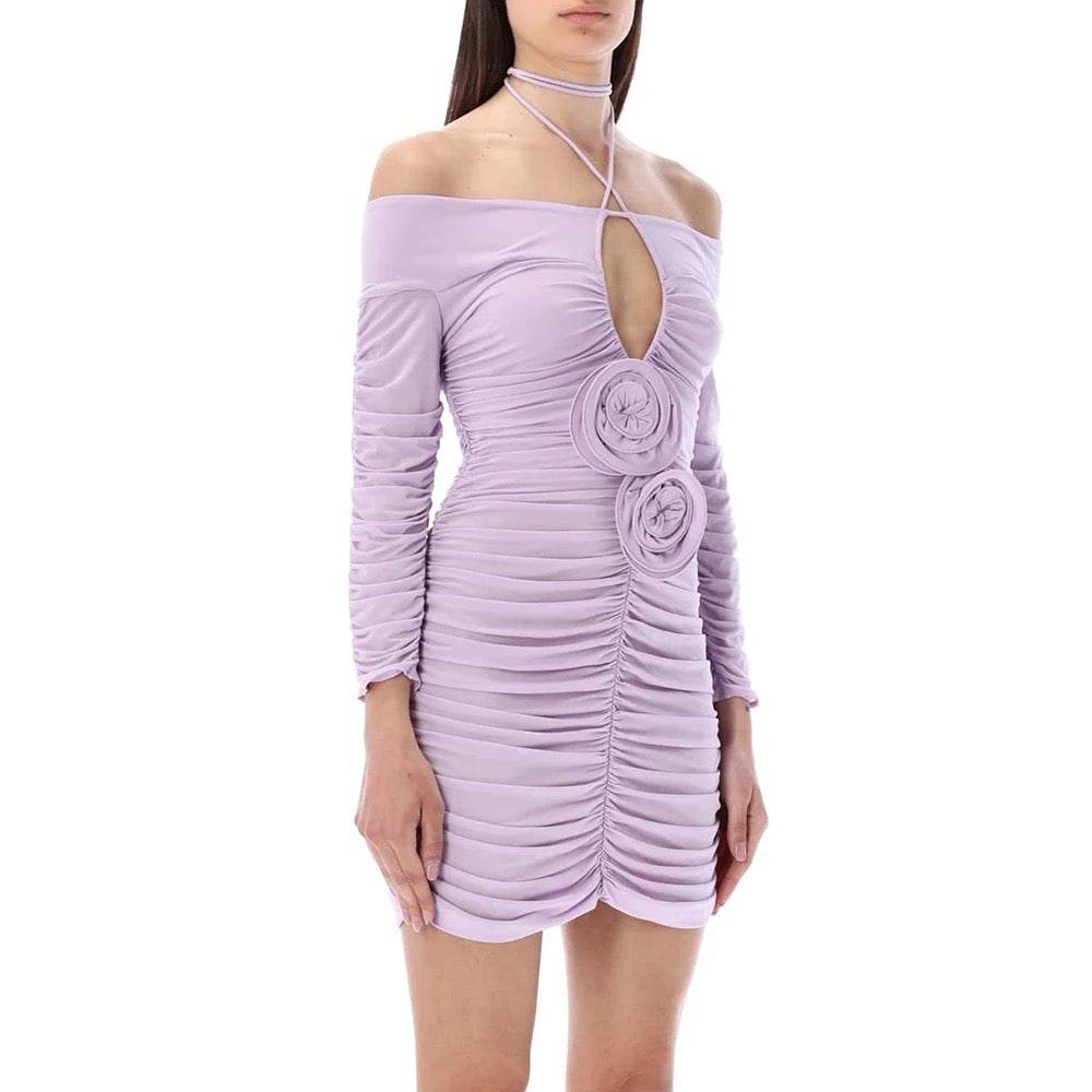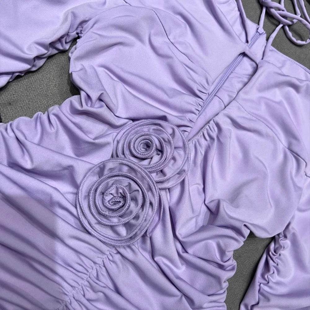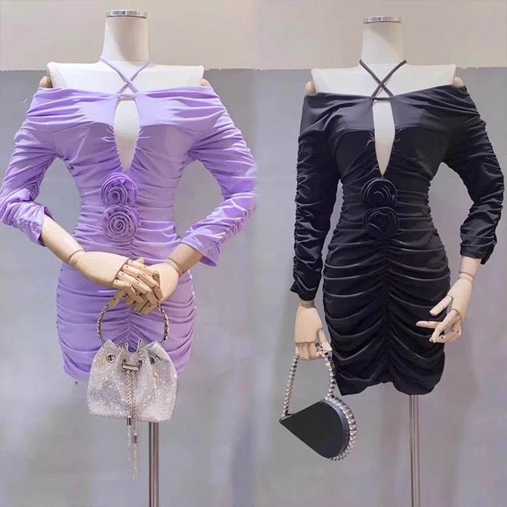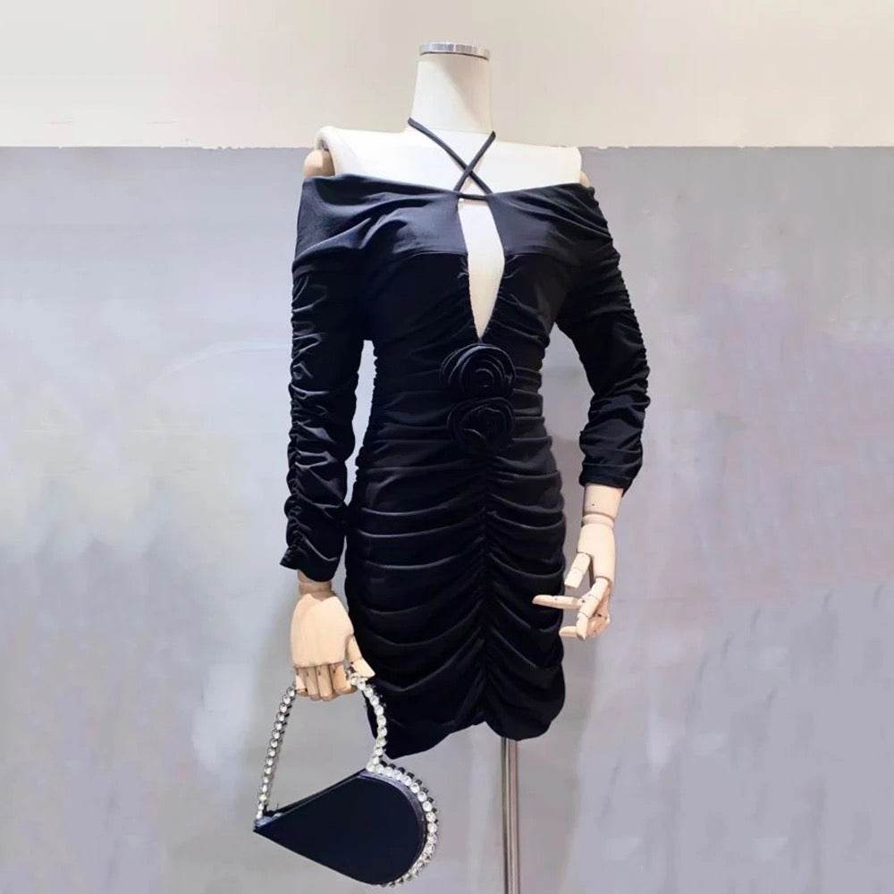 Off Shoulder Long Sleeve Pleated 3D Flower Mini Dress