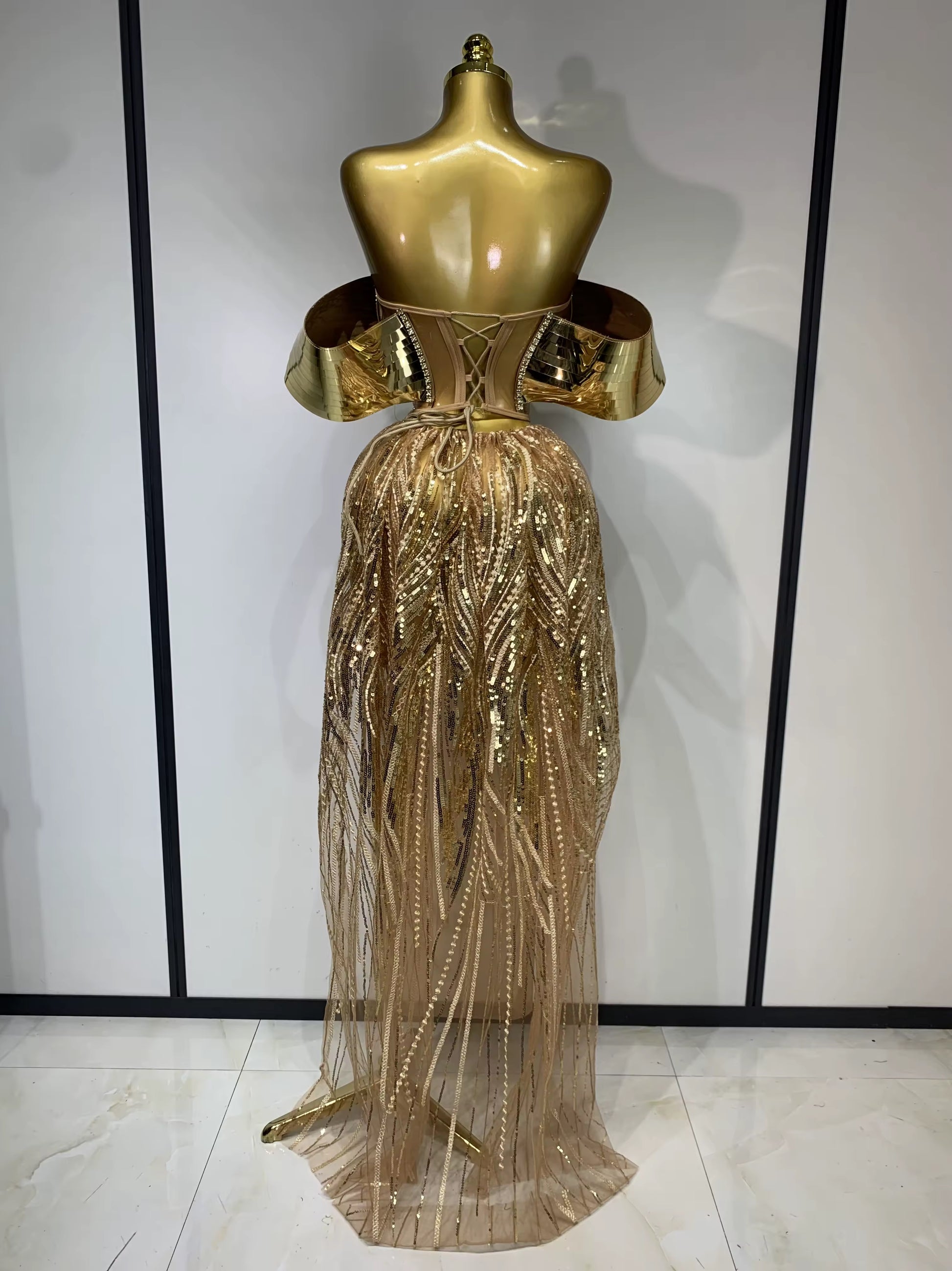 Step into the spotlight with our stunning Rhinestone Sequins See Through Birthday Gown. This exquisite piece features a sexy off-shoulder design that beautifully highlights your neckline and shoulders, making it perfect for any celebration.