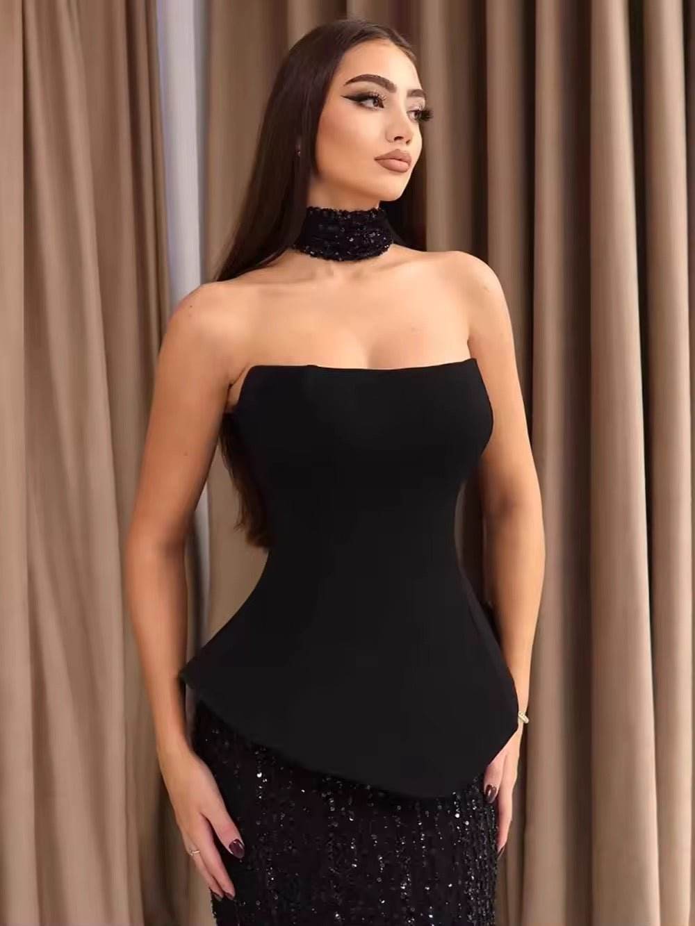 Get ready to turn heads and make a bold fashion statement with our latest creation - the Sequined Mesh Patchwork Strapless Maxi Dress with Ribbon. This dress is the perfect combination of elegance and sexiness, making it a must-have for any fashion-forward woman.