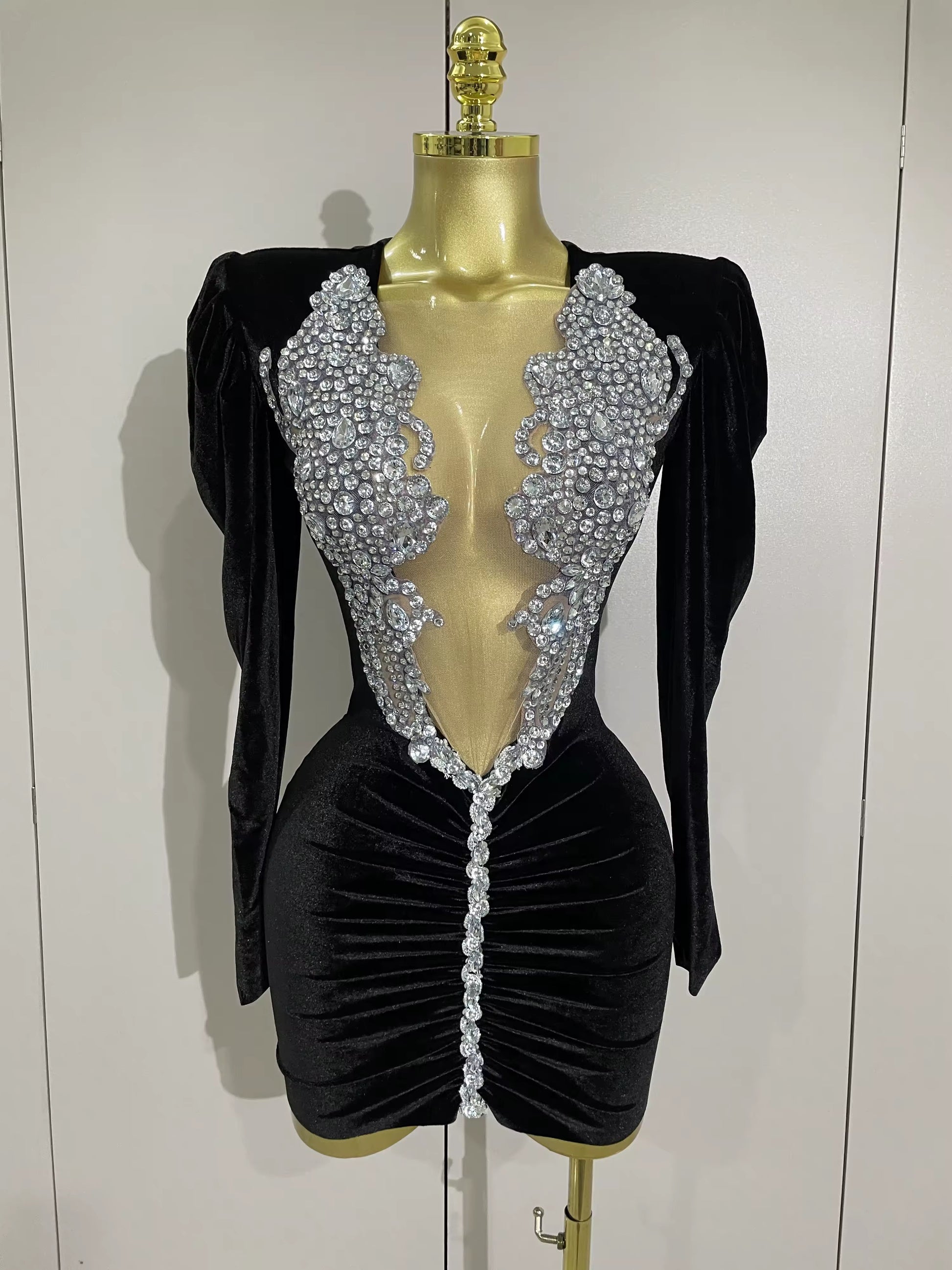 Sparkly Crystals Sexy Mesh Black Velvet Short Dress