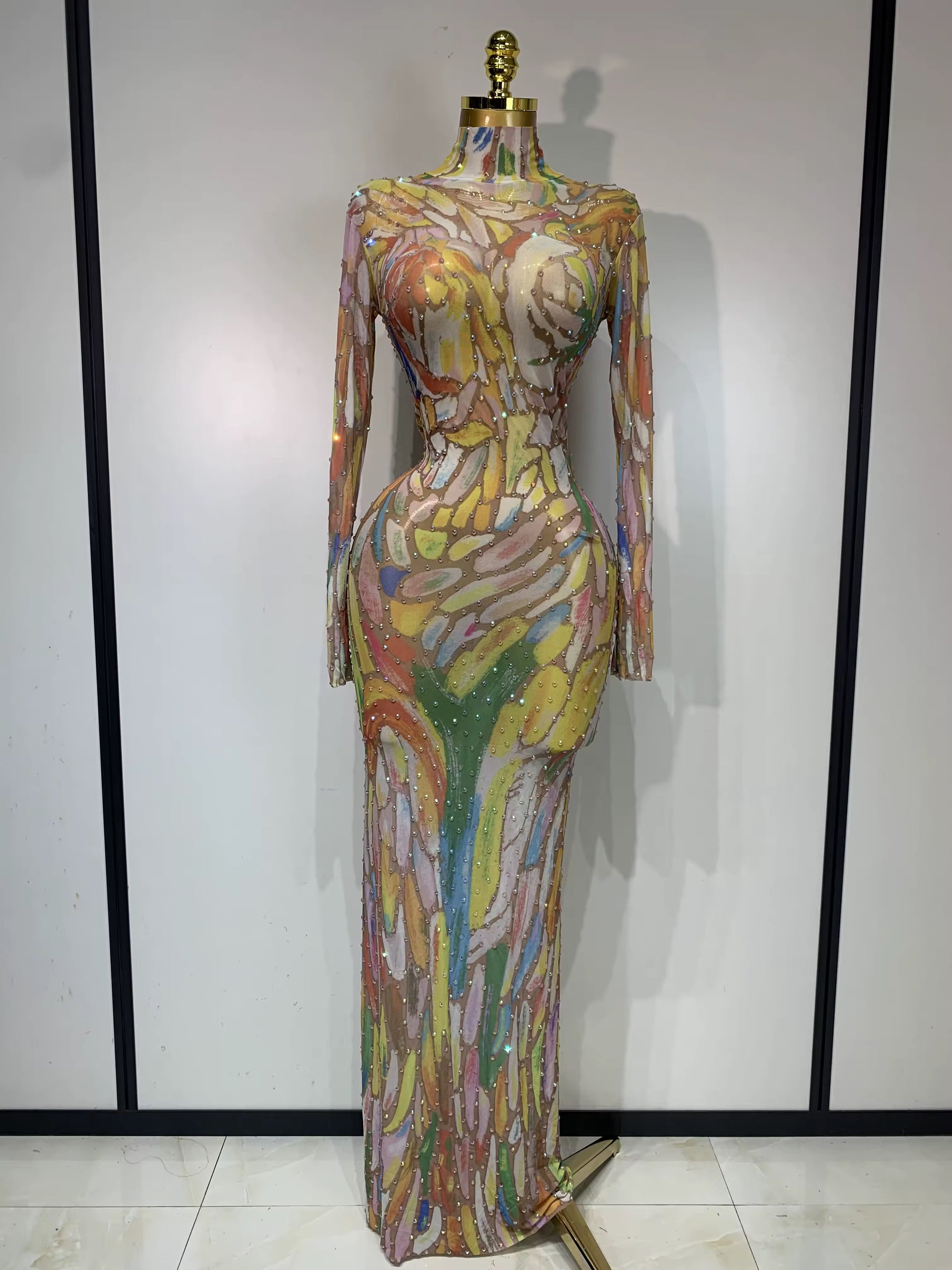 Sparkly Rhinestone Stretchy Mesh See Through dress