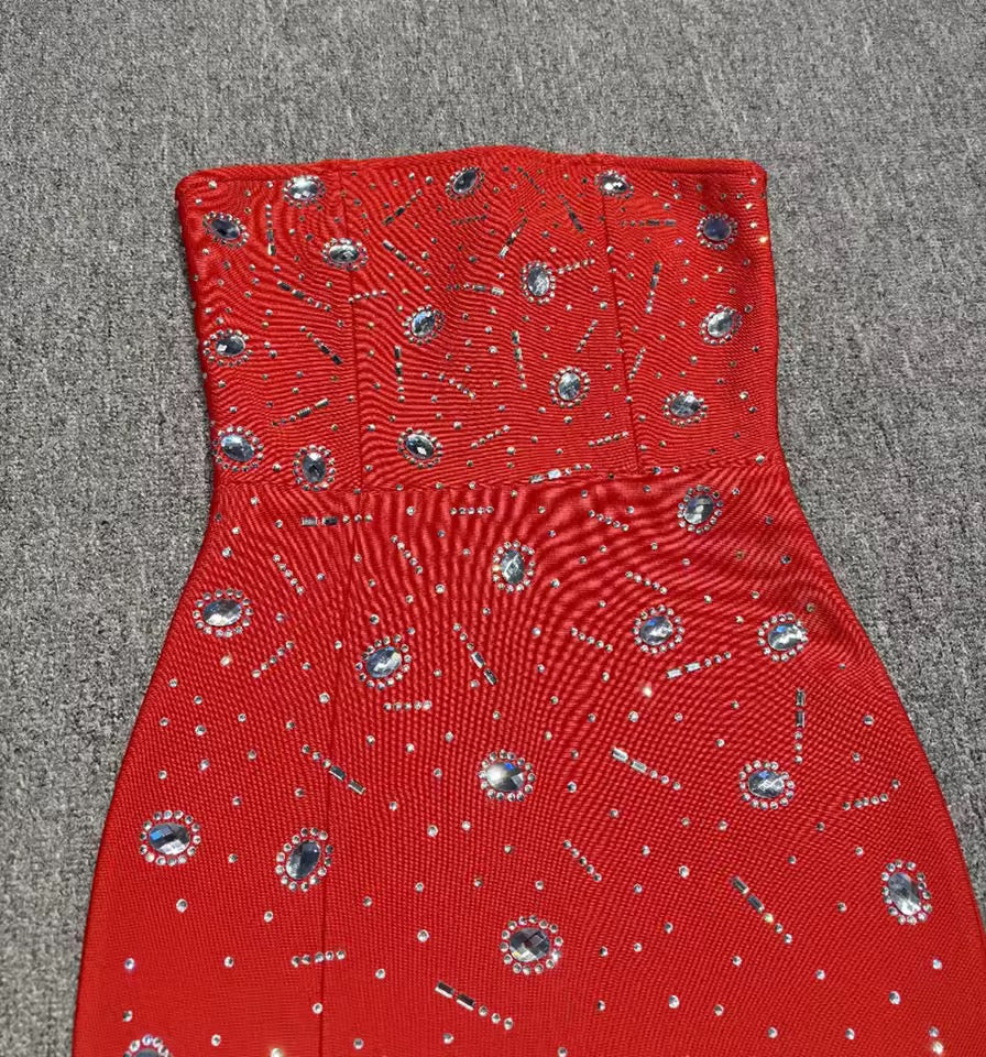 Crafted from high-quality bandage material, it offers both comfort and support, ensuring you feel confident all night long. The strapless design showcases your shoulders, while the diamond detailing adds a touch of glamour. Perfect for special occasions or a night out, this dress is a must-have for the fashion-forward woman.
