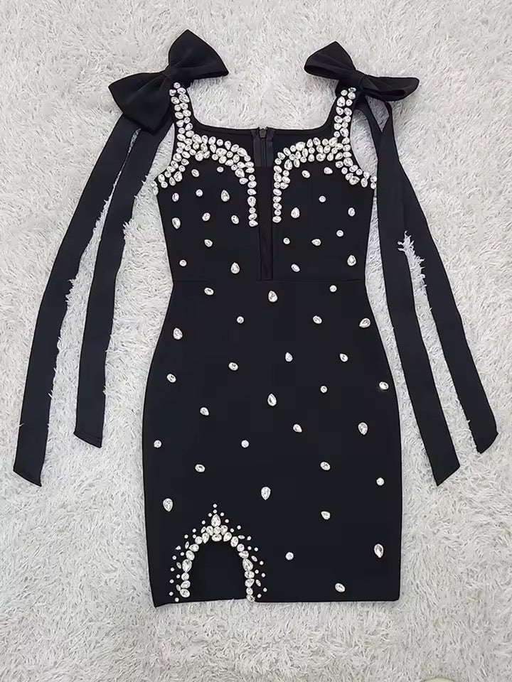Tie Bow Spaghetti Strap Black Sexy Diamond Tight Mini Dress