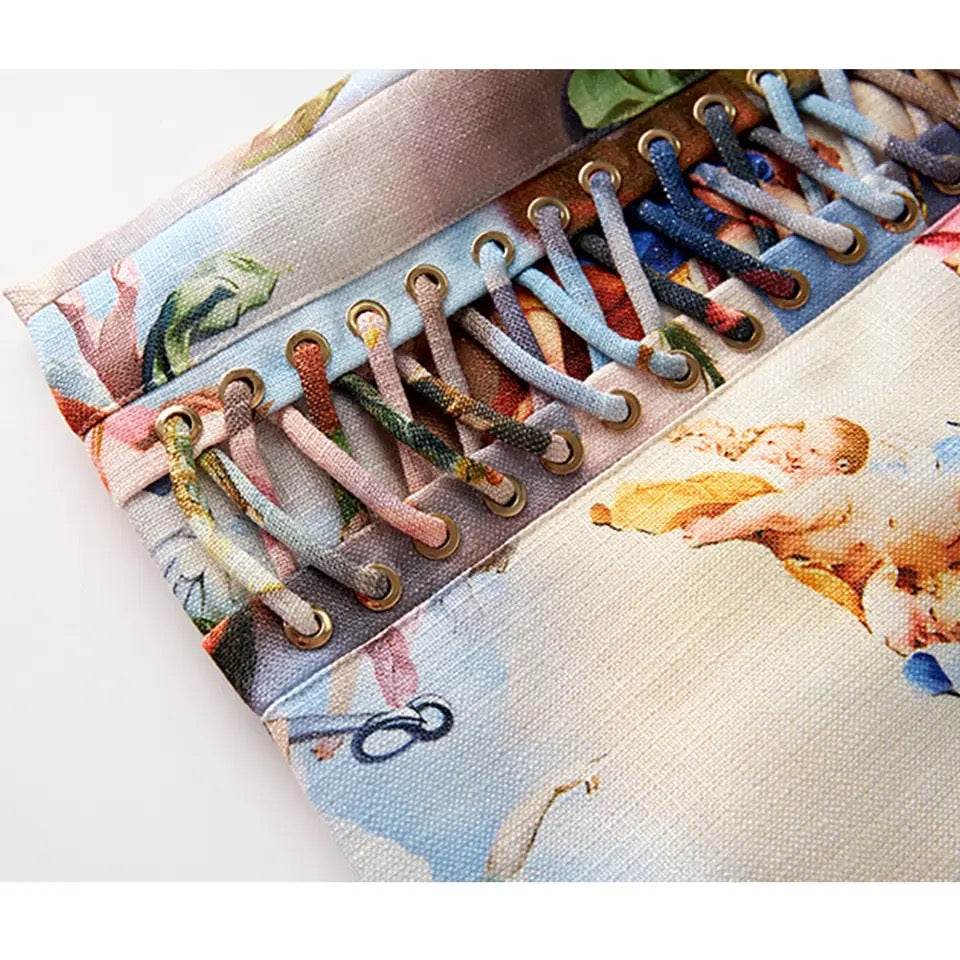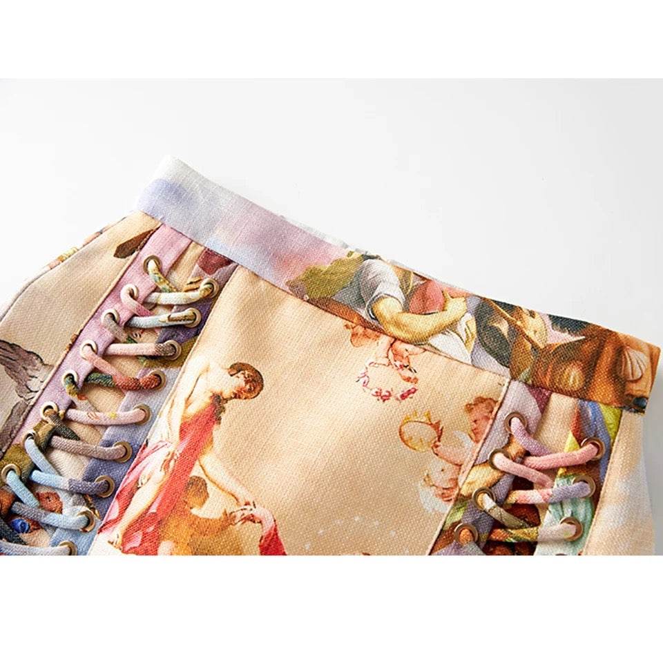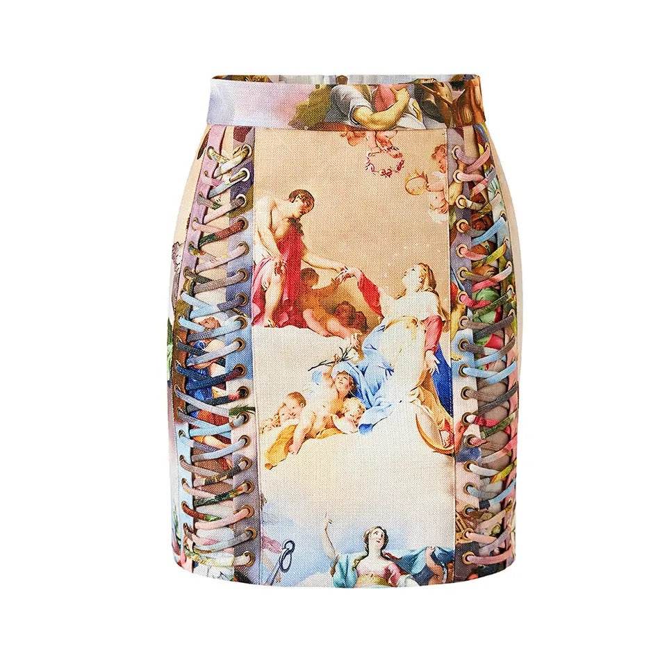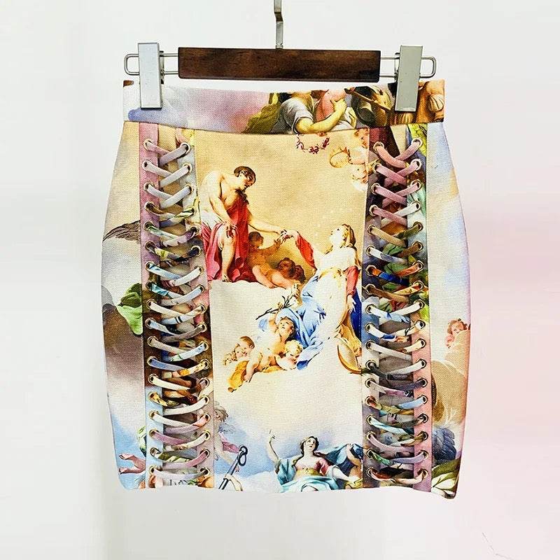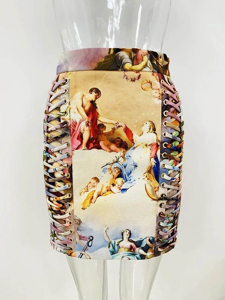 Slim Pencil Mini Vintage Printing Lace-up Skirt
