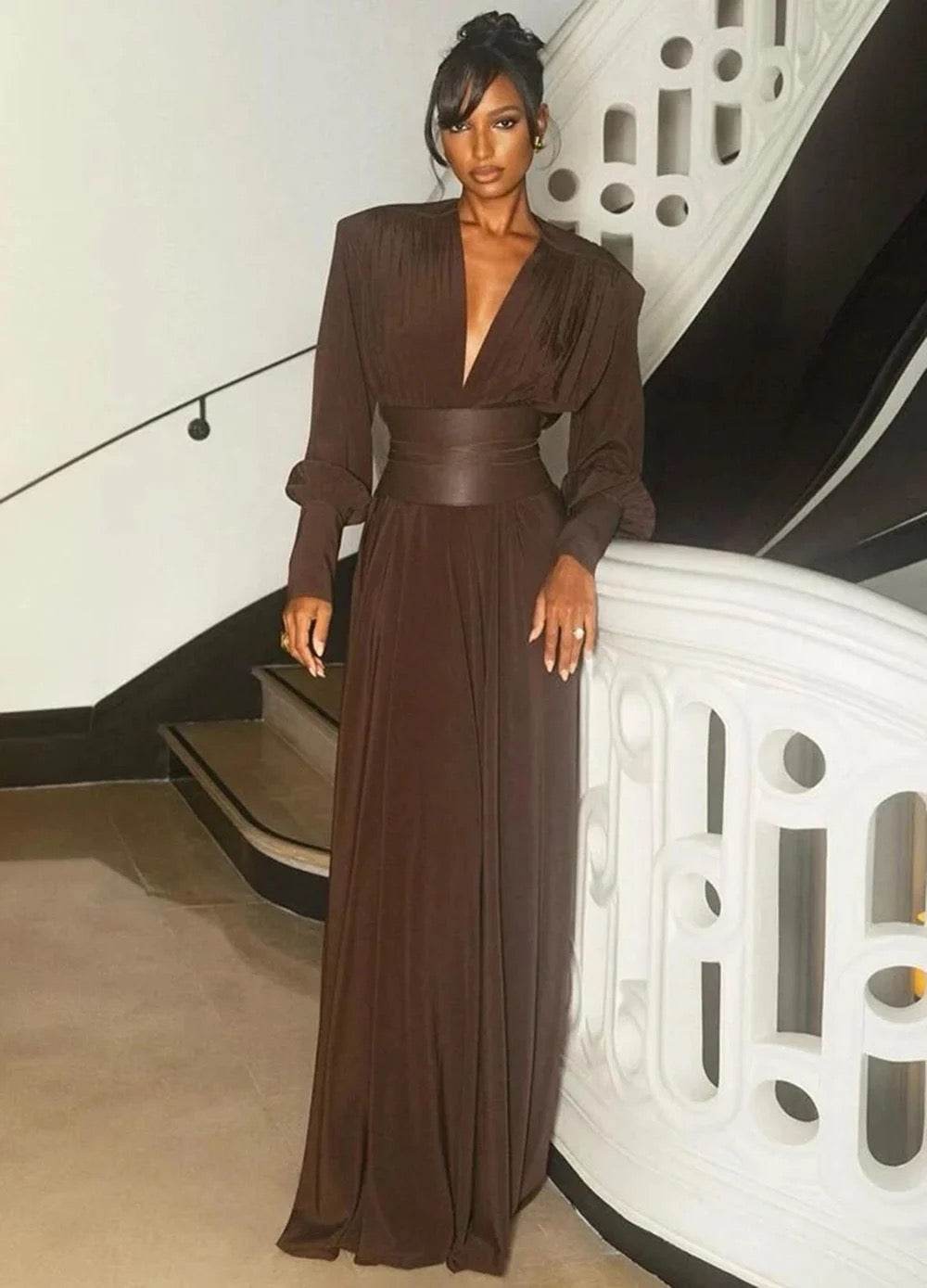 V-neck, High Waist Belt, Long Sleeves Dress