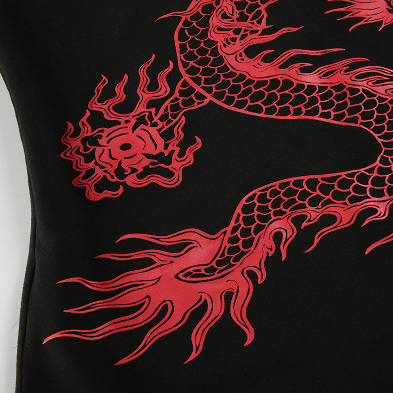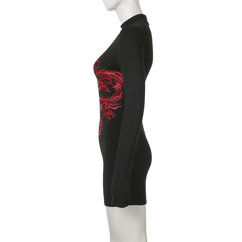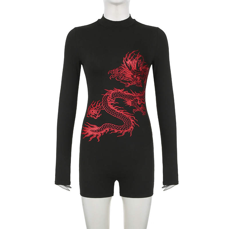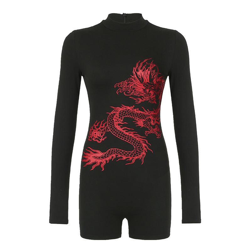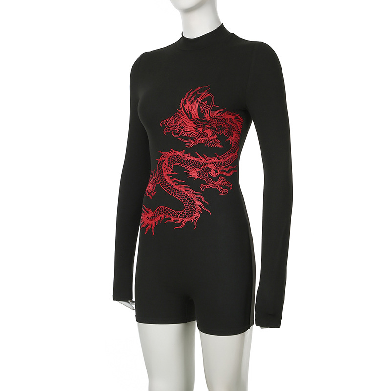 Dragon Print Jumpsuit Half Turtleneck Slim Fit Sports Long Sleeve Narrow